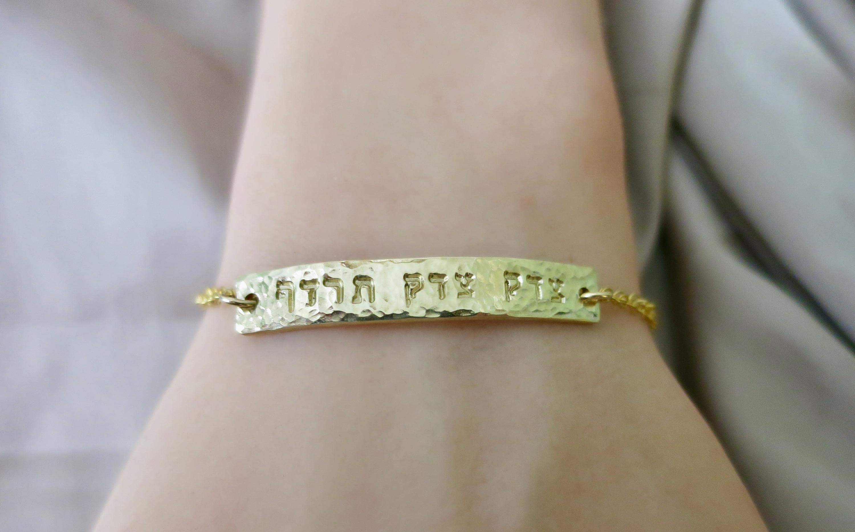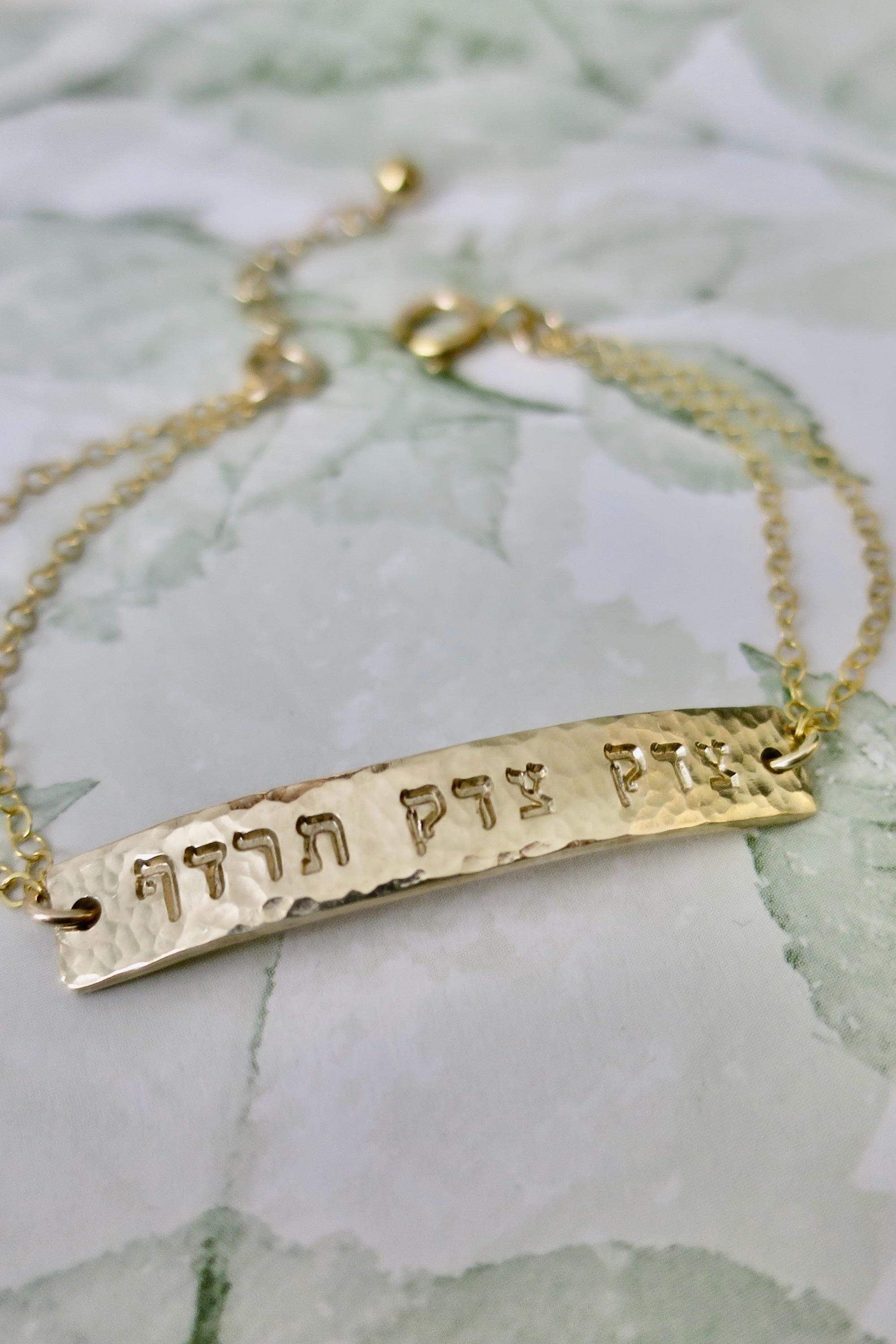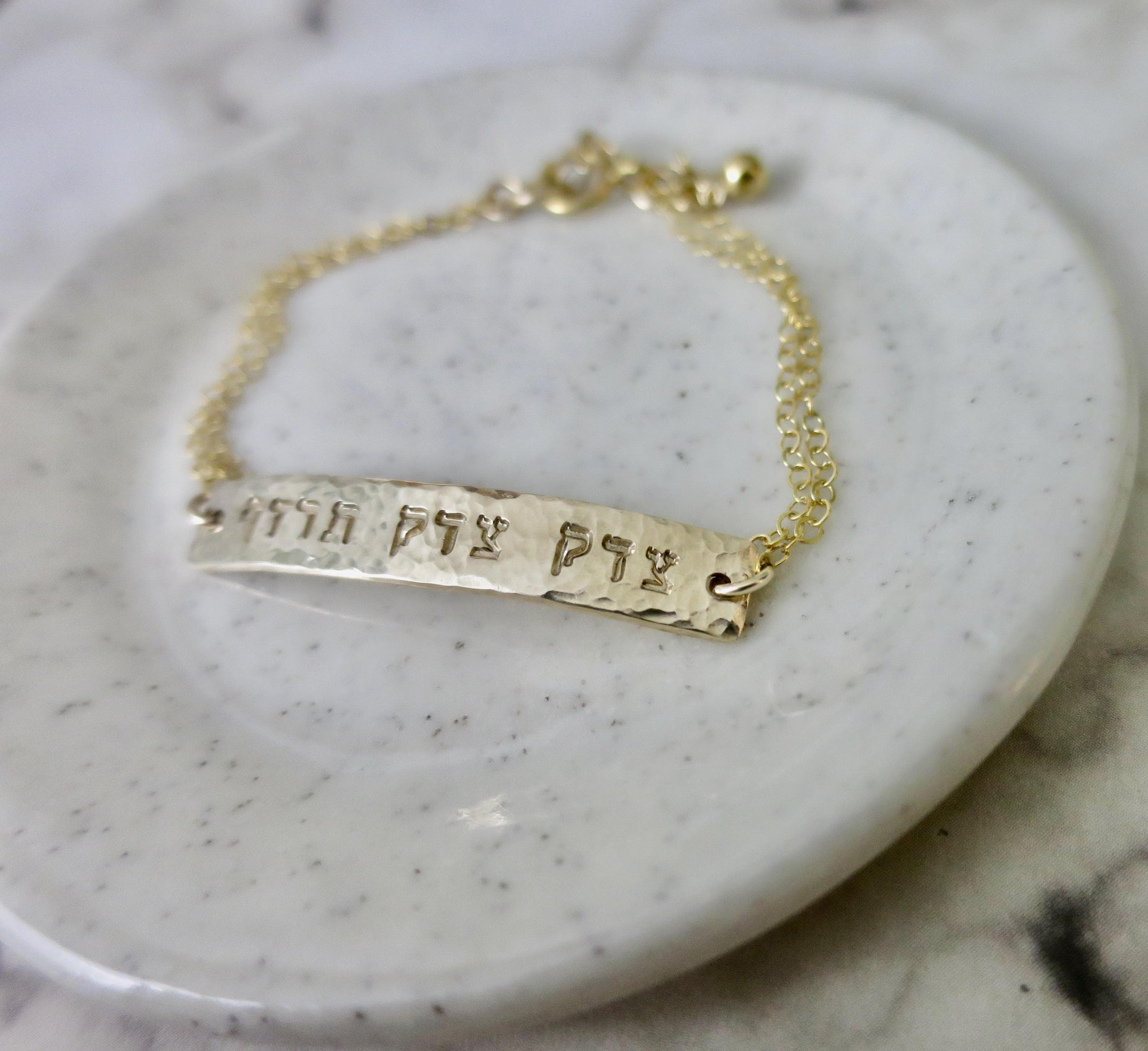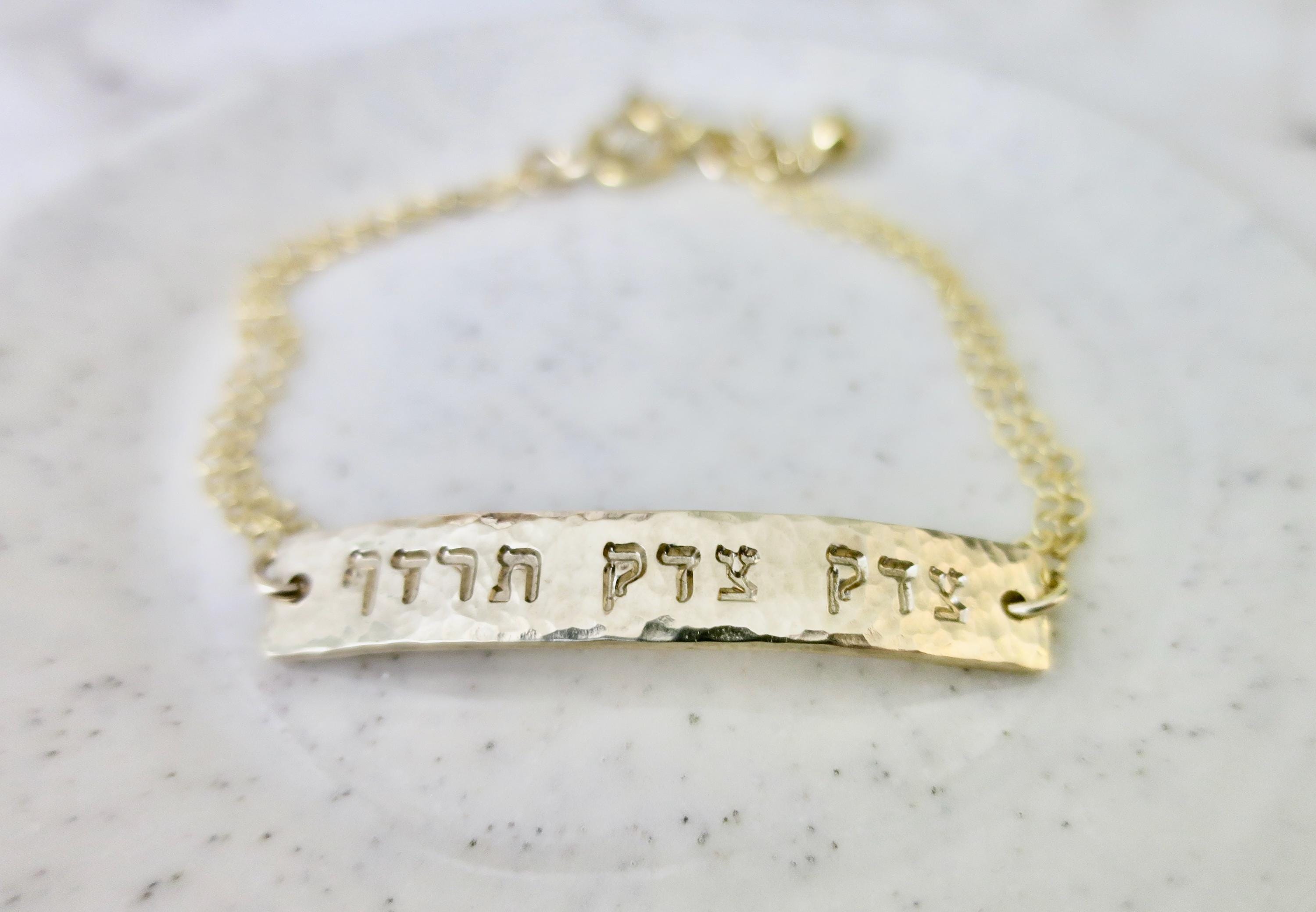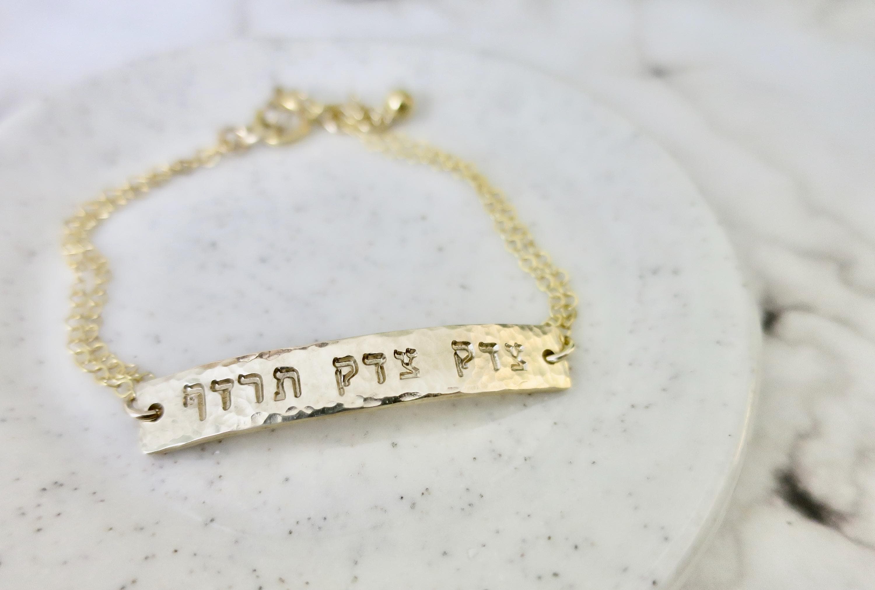 A meaningful piece of wearable Torah, this hammered 14k gold-filled bar bracelet features the powerful Hebrew phrase "Tzedek Tzedek Tirdof" (Justice, Justice You Shall Pursue) from Deuteronomy 16:20.
