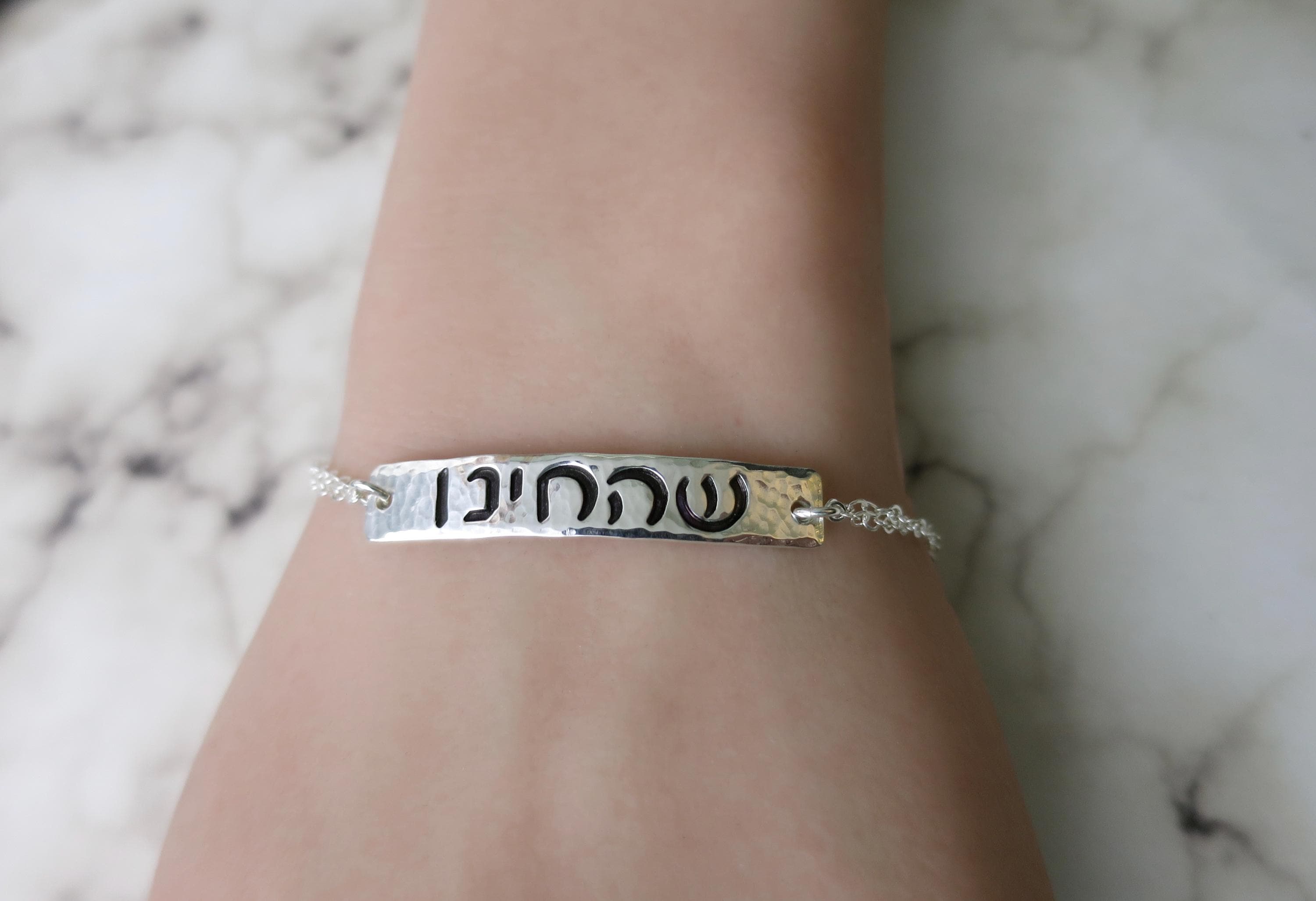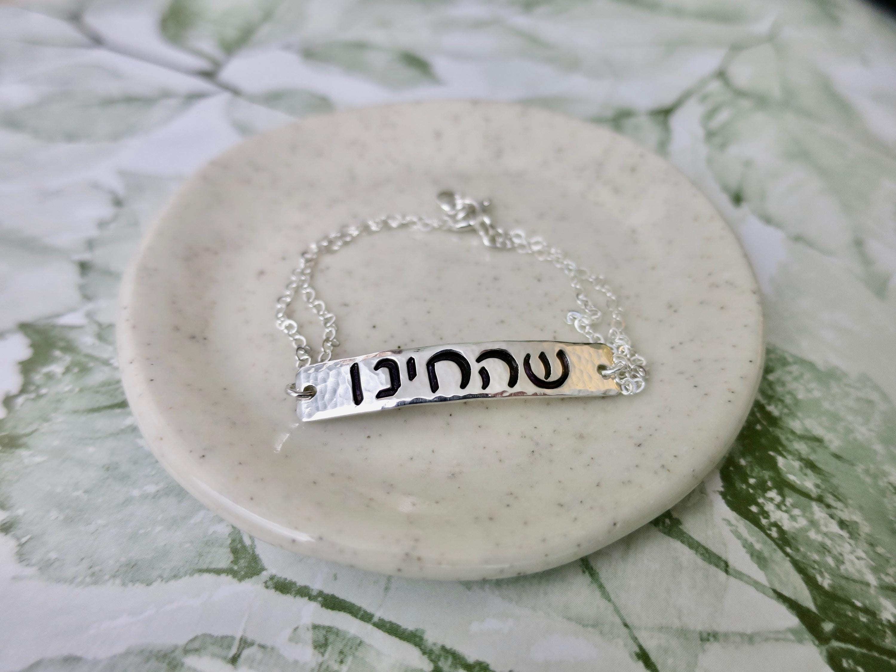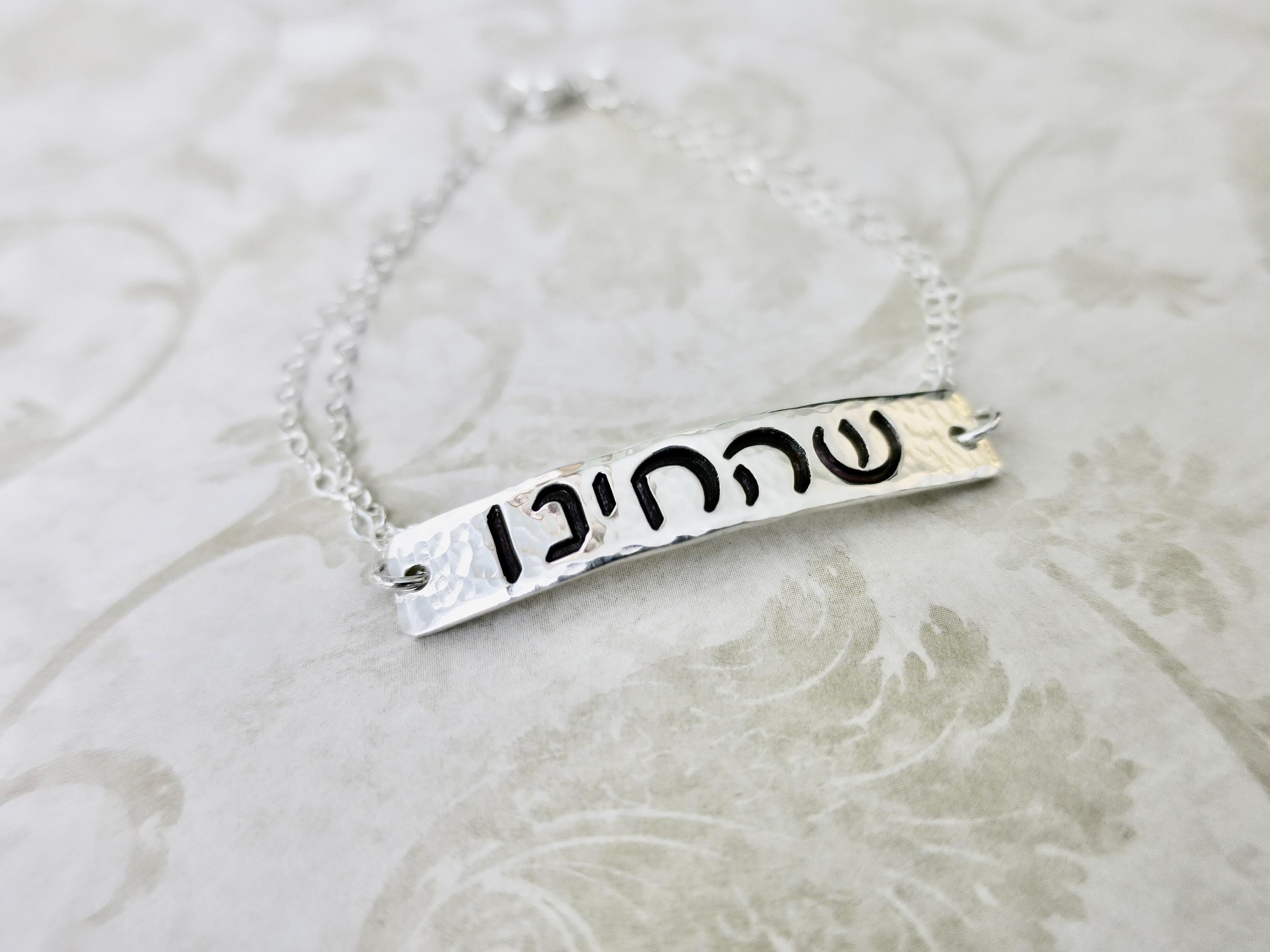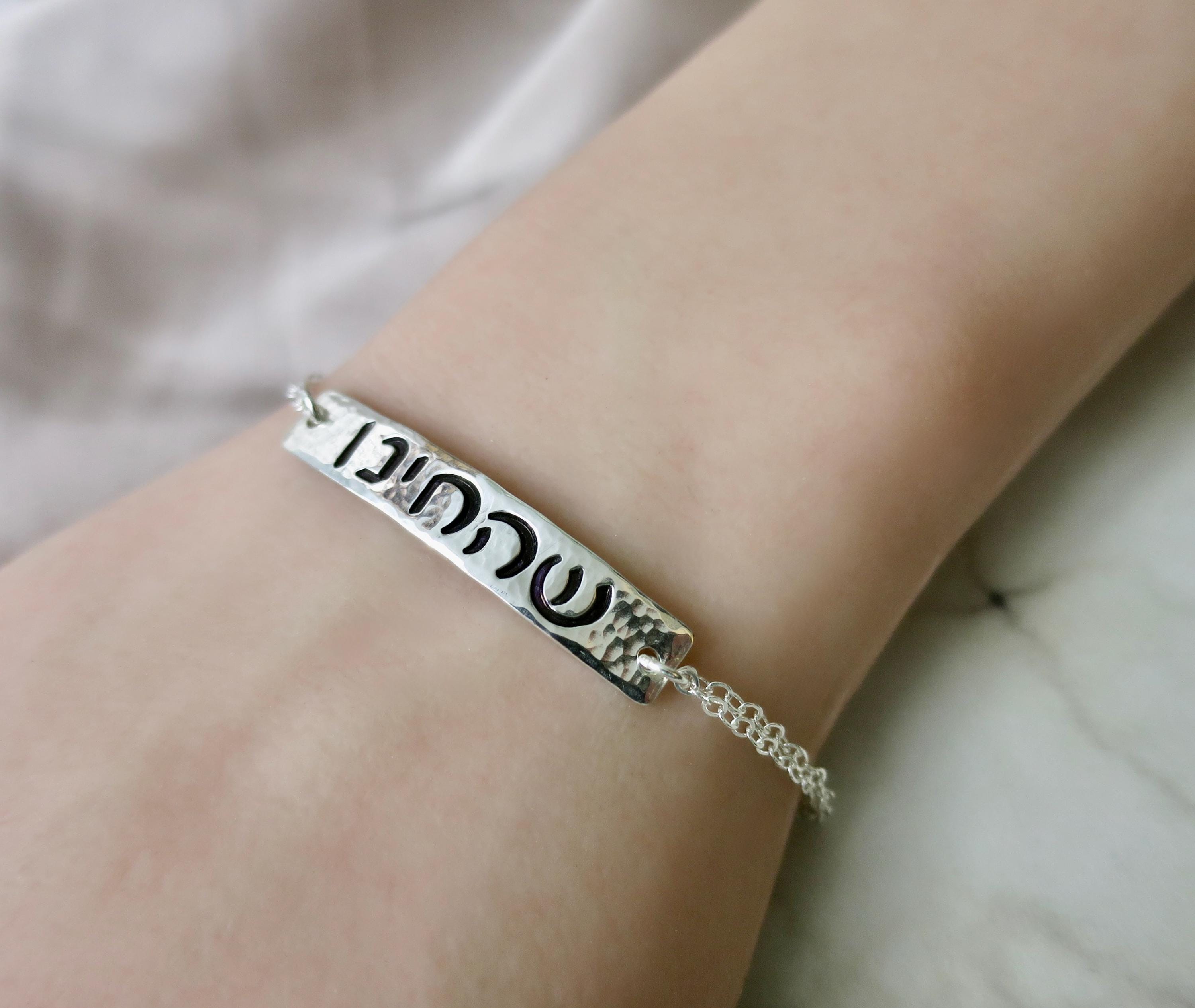 A meaningful piece of wearable faith, this hand-stamped sterling silver bracelet bears the cherished Shehecheyanu blessing in Hebrew - a prayer of gratitude for new moments, milestones, and blessings.