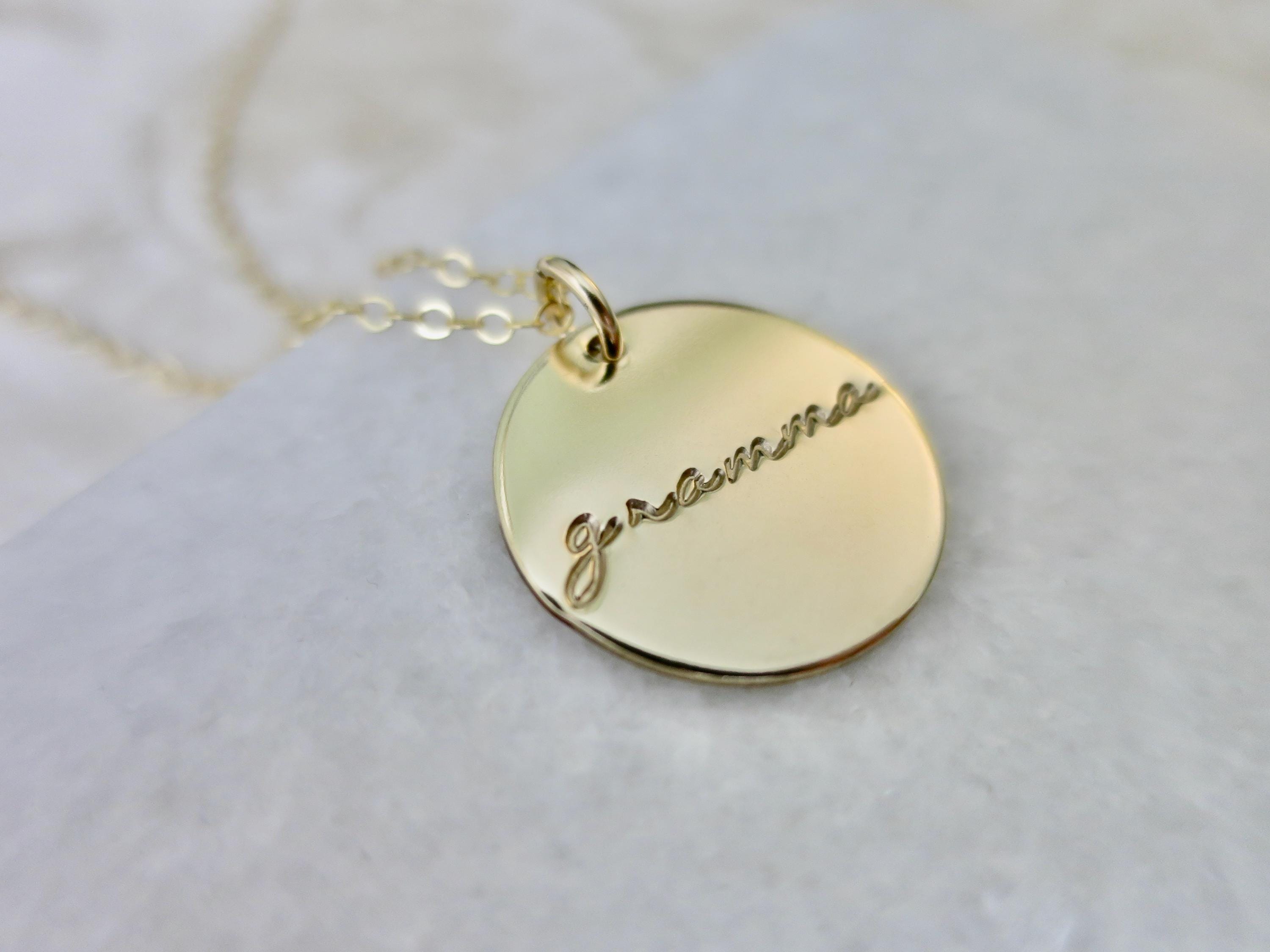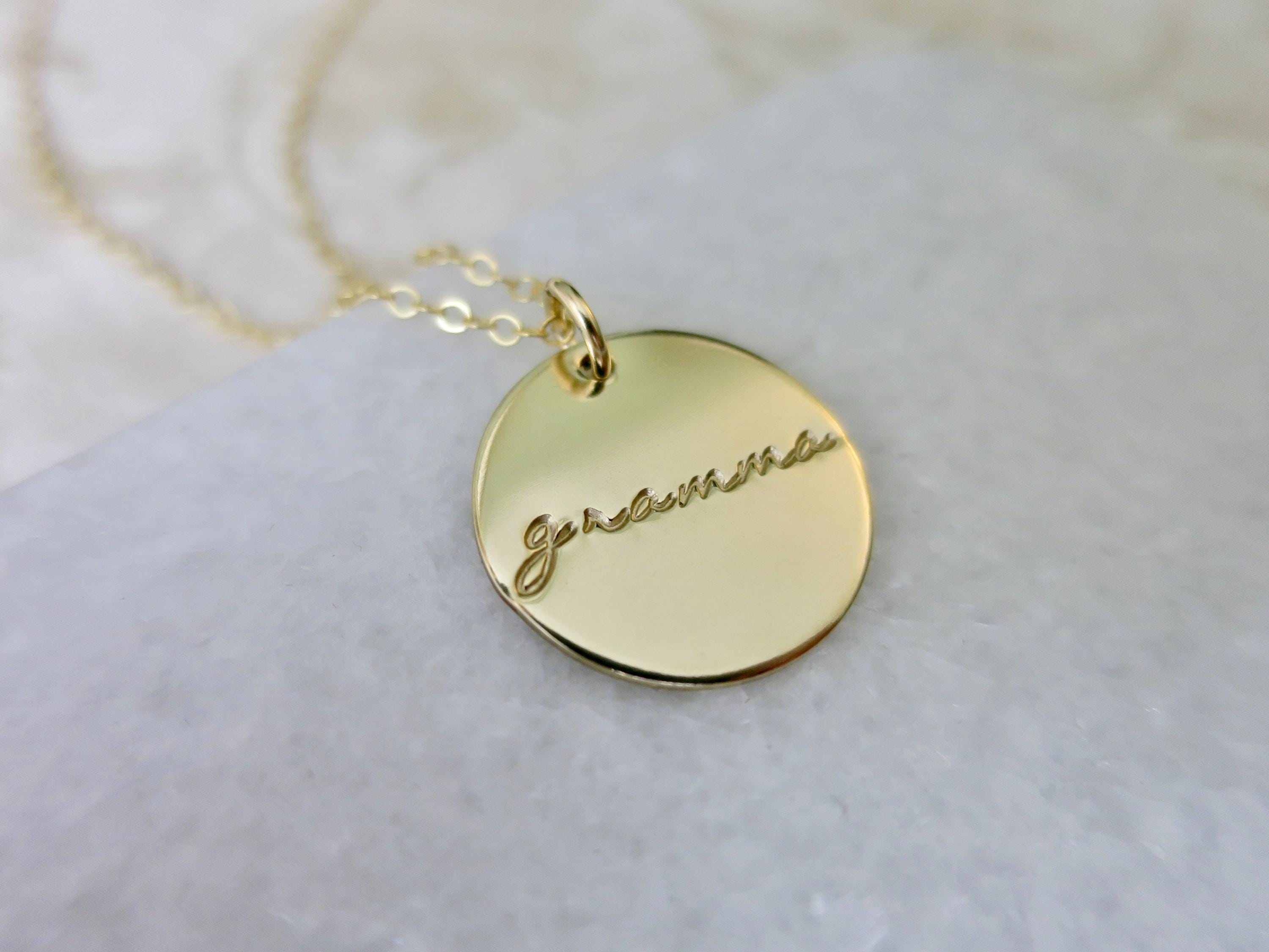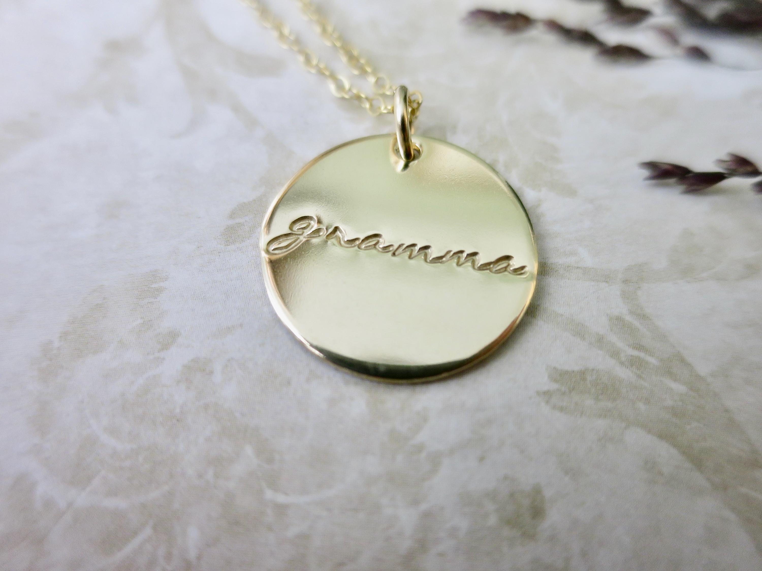 Celebrate the incredible grandmother in your life with this beautiful, hand-stamped pendant necklace. Each piece is lovingly crafted with delicate script lettering that reads either "grammy" or "gramma" in an elegant rolling lowercase font.