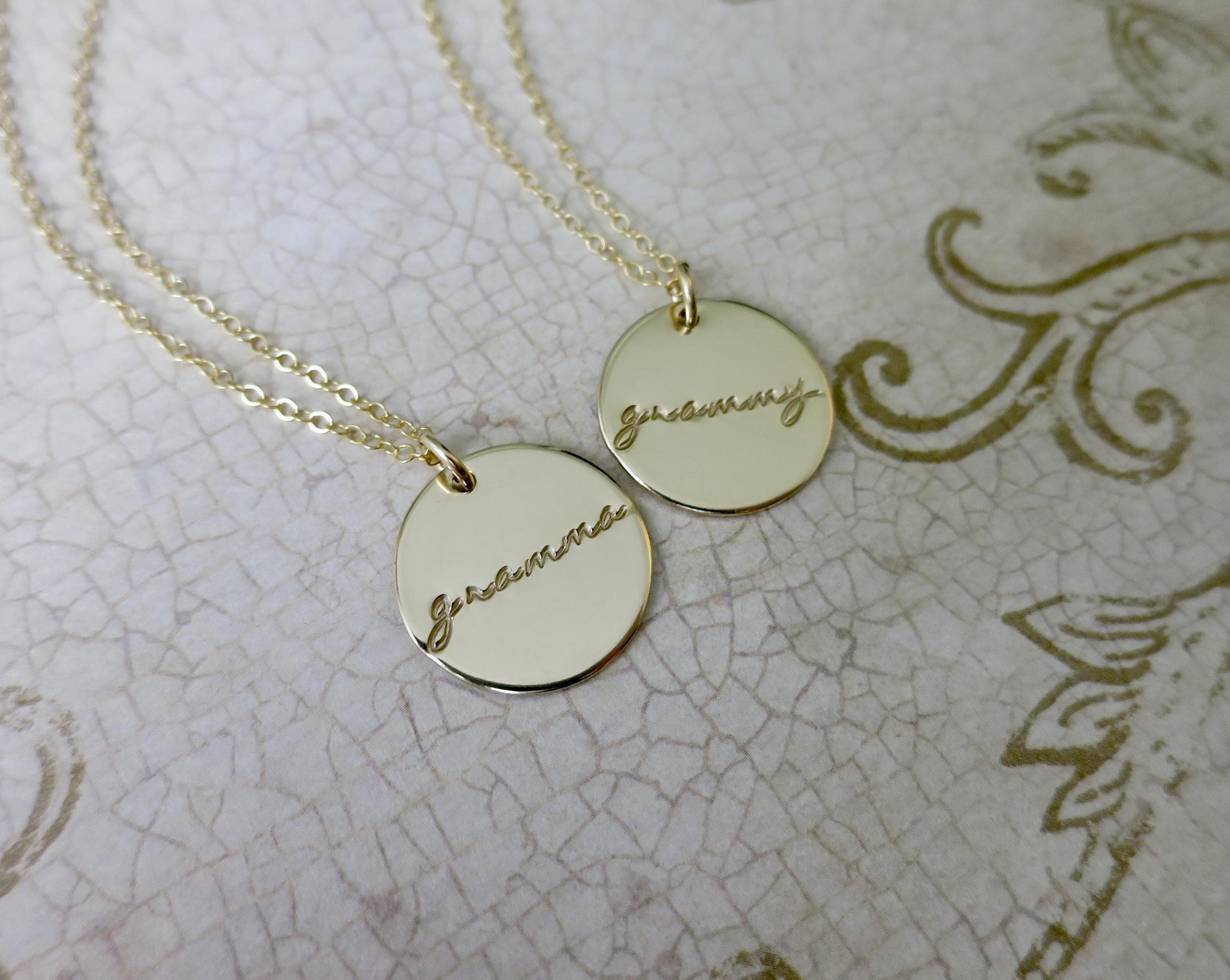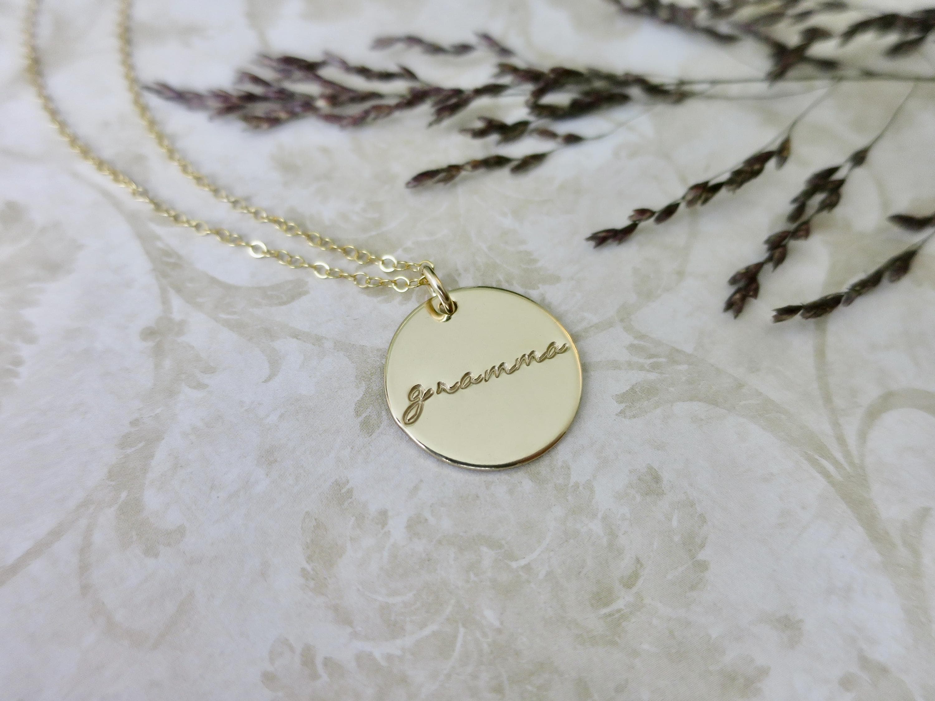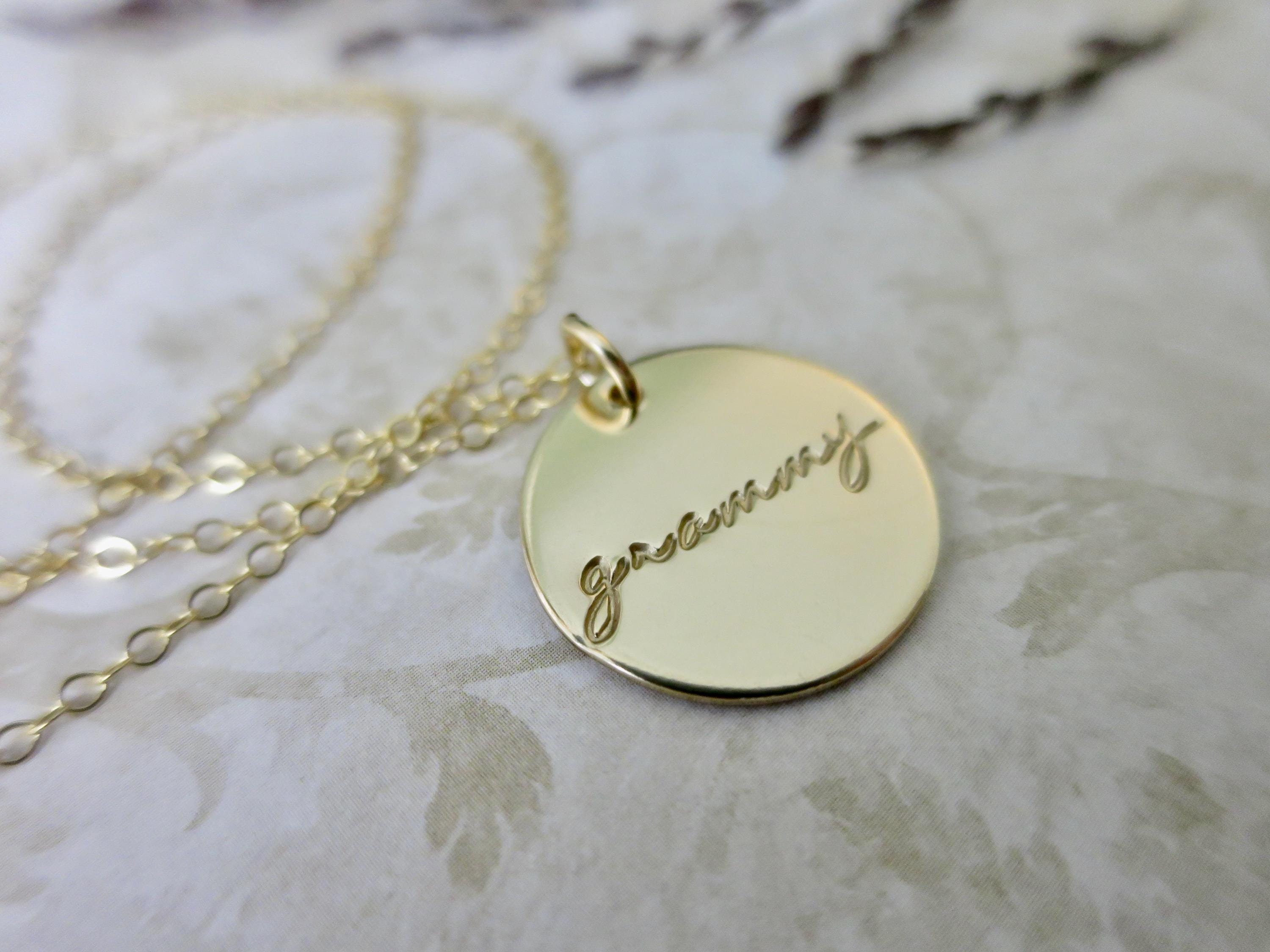 Celebrate the incredible grandmother in your life with this beautiful, hand-stamped pendant necklace. Each piece is lovingly crafted with delicate script lettering that reads either "grammy" or "gramma" in an elegant rolling lowercase font.