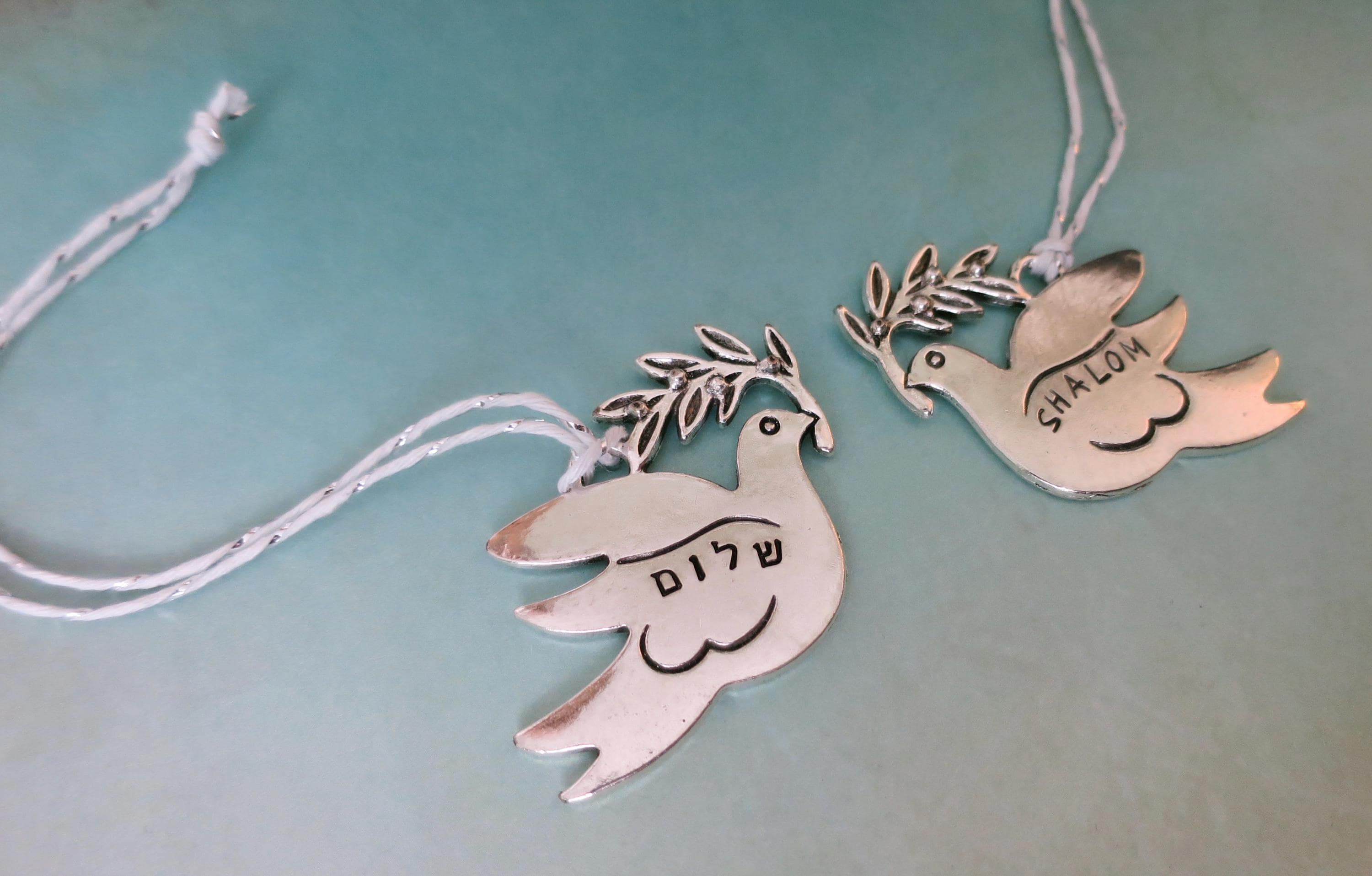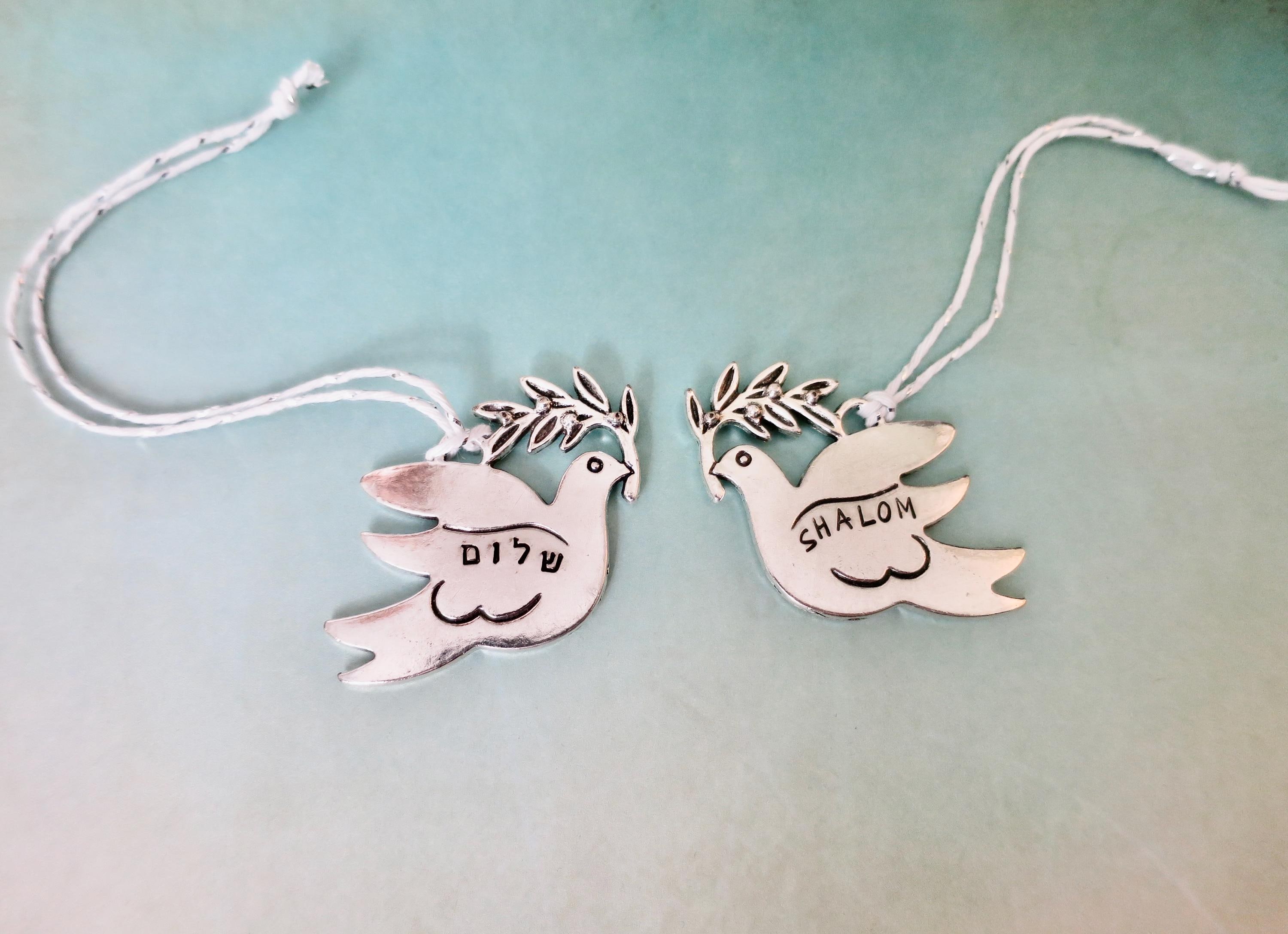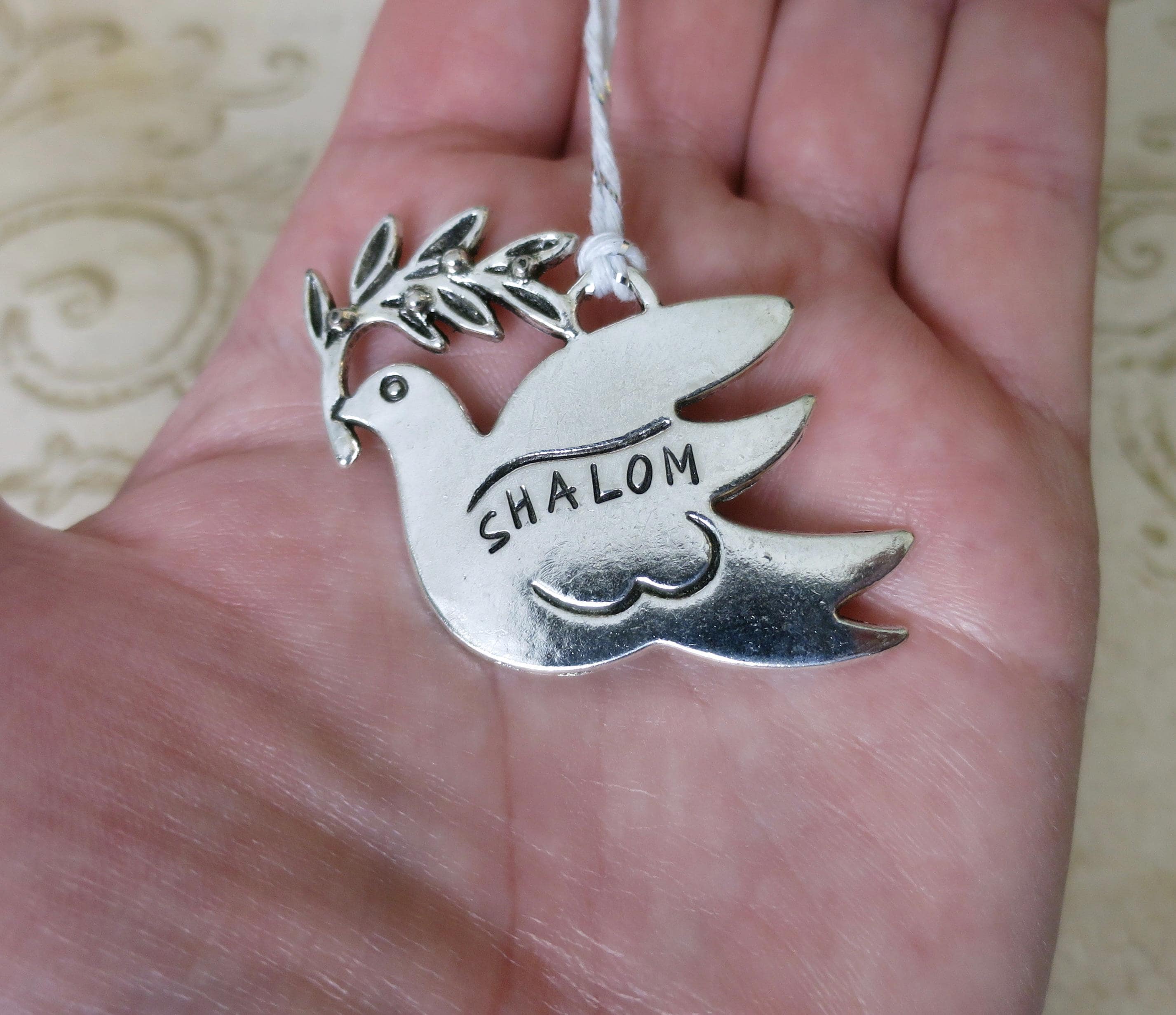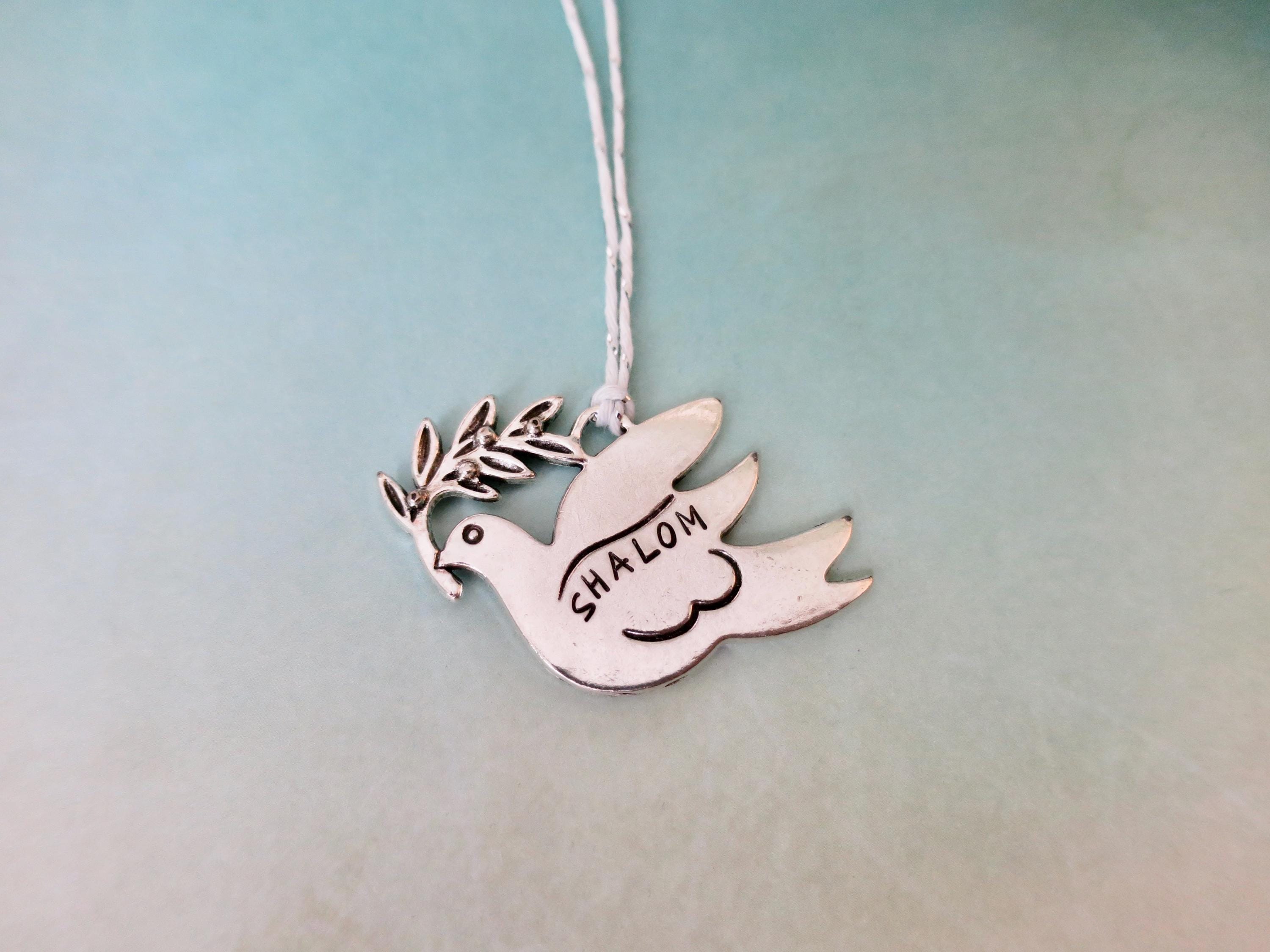 - Design: Dove holding olive branch with hand-stamped "Shalom" text