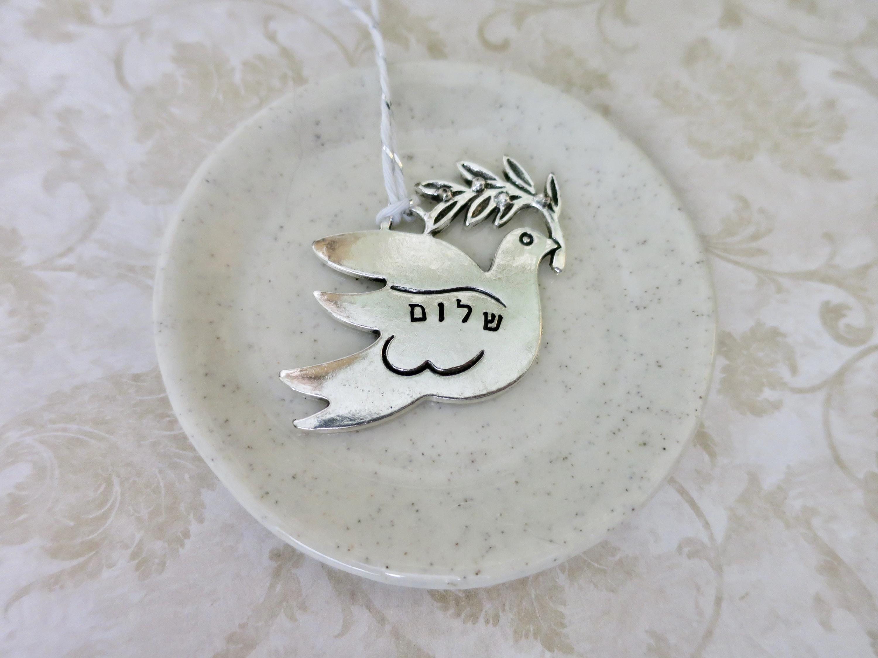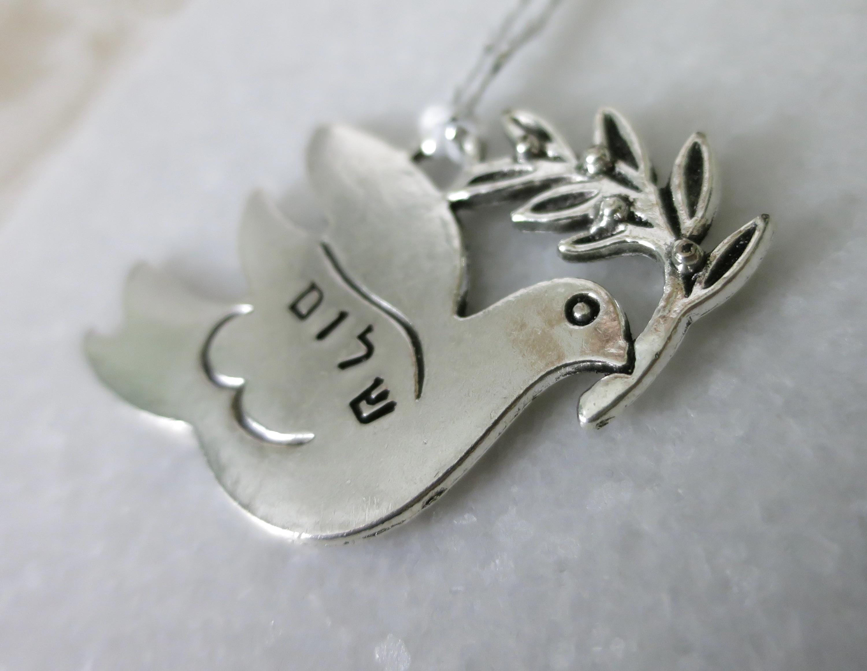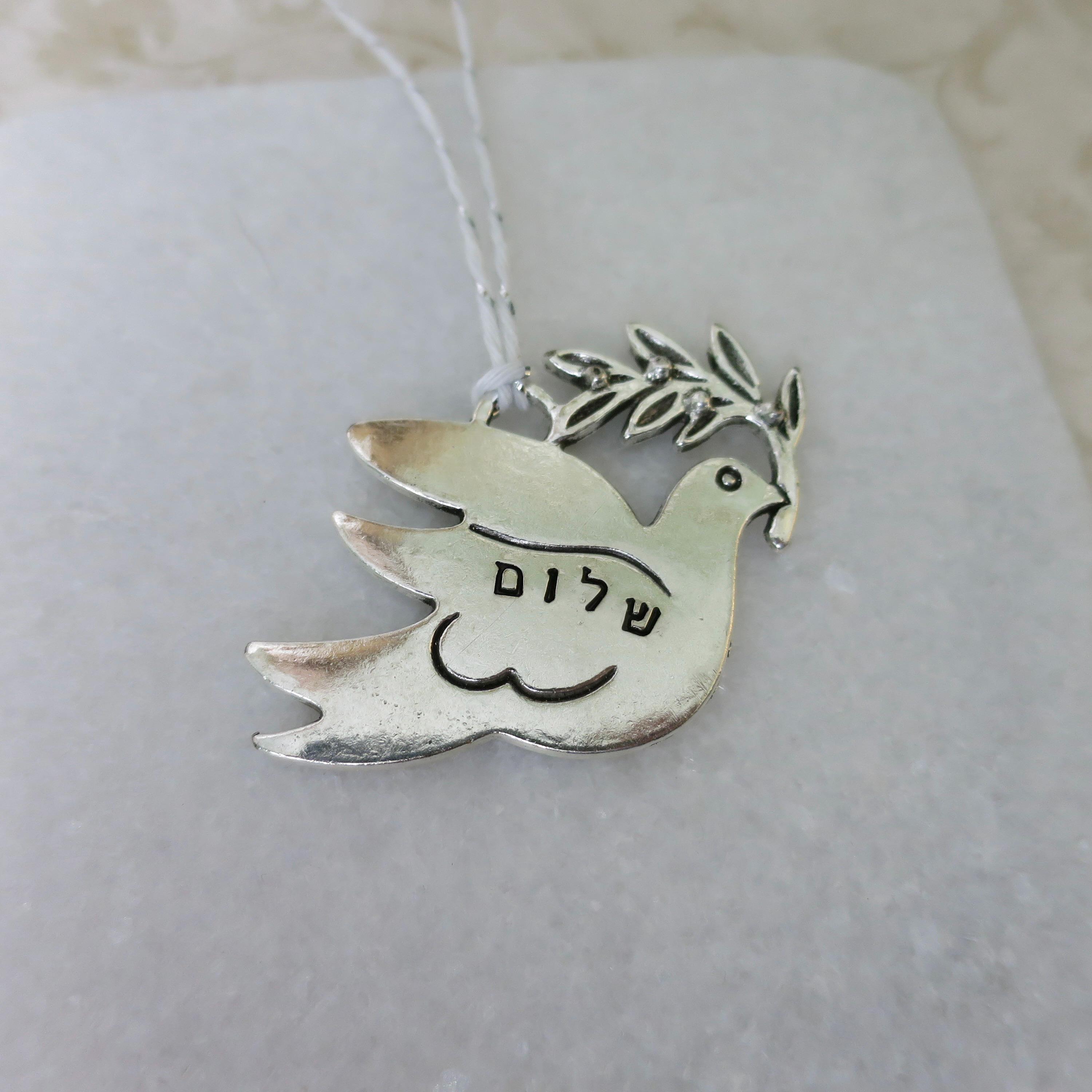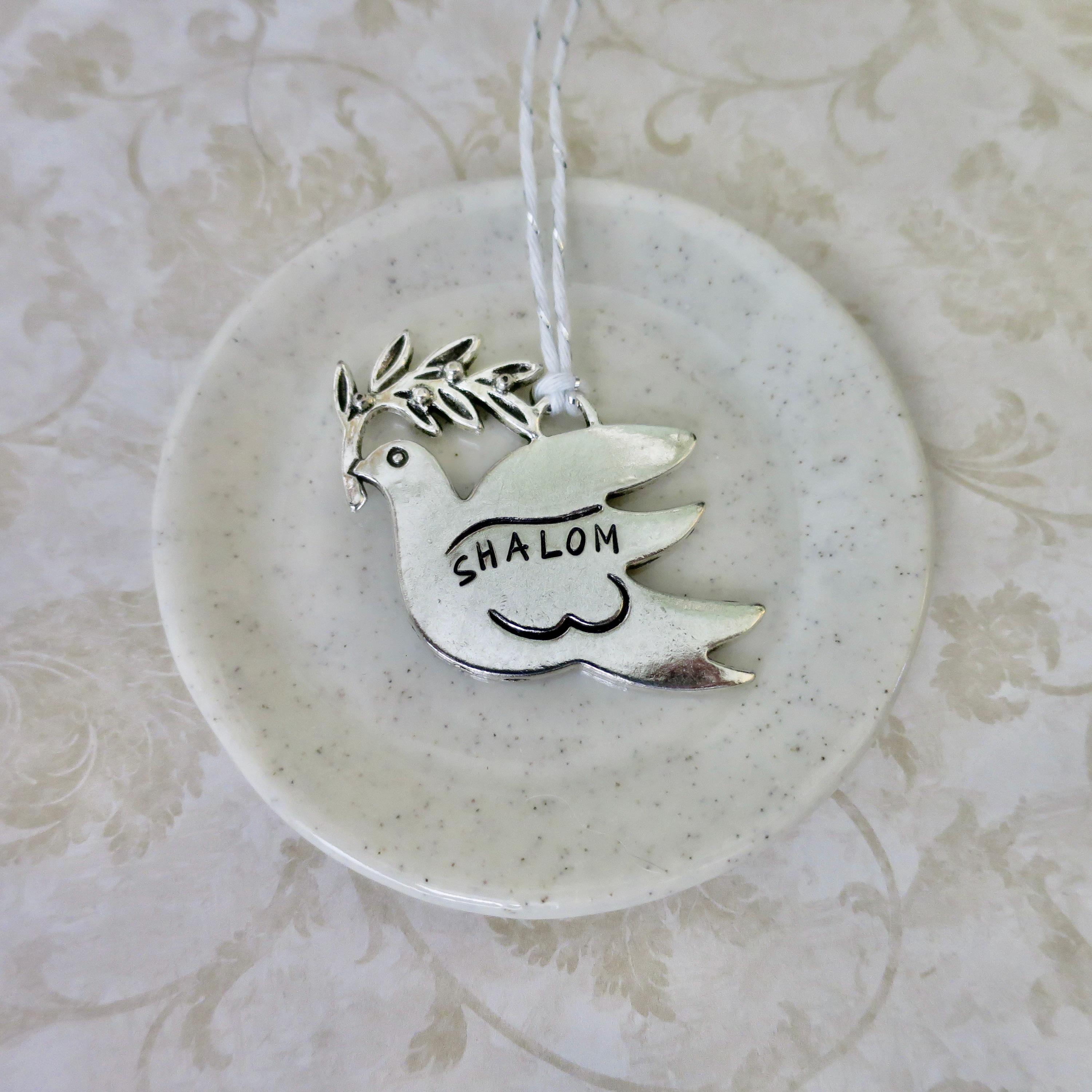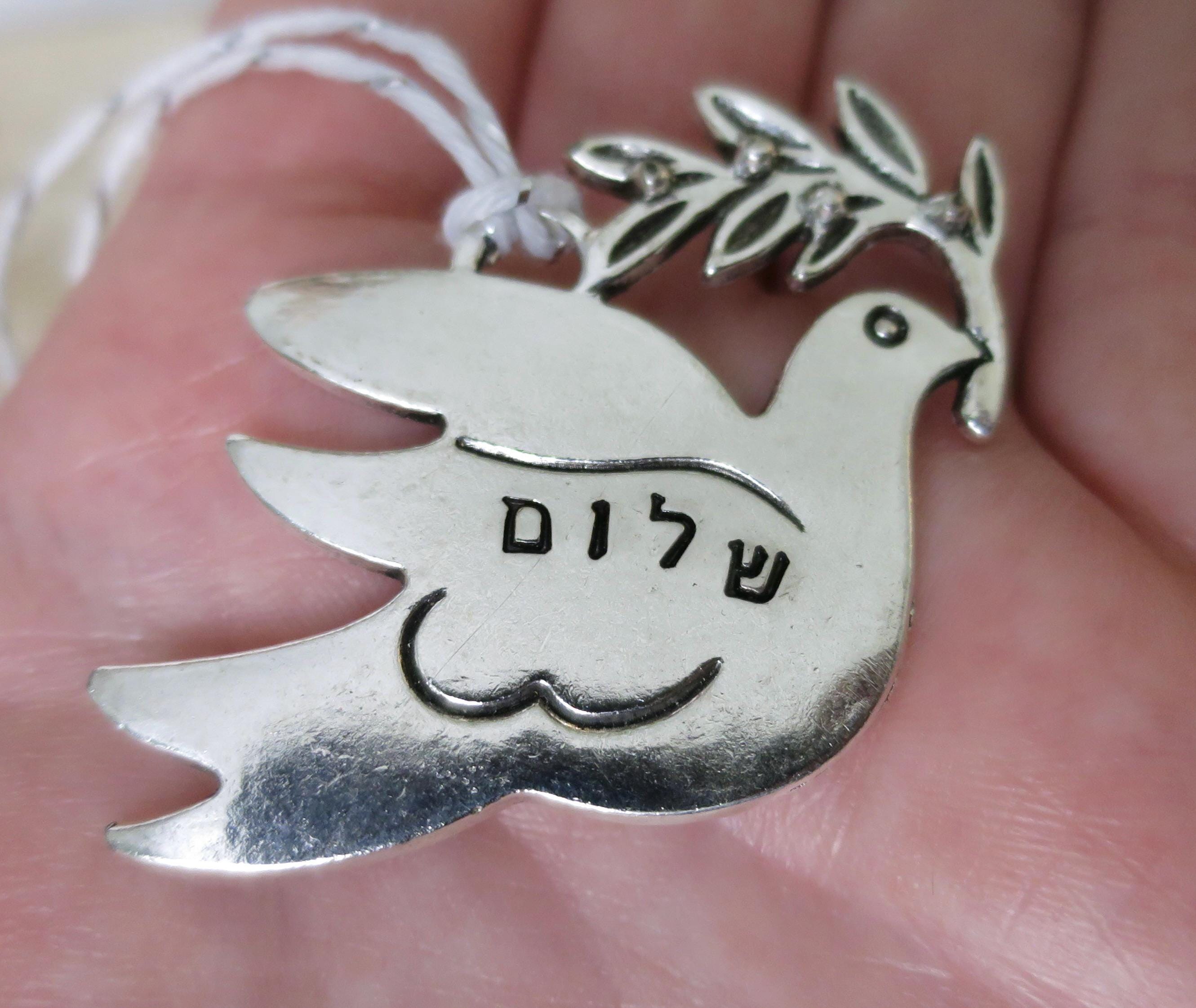 - Design: Dove holding olive branch with hand-stamped "Shalom" text