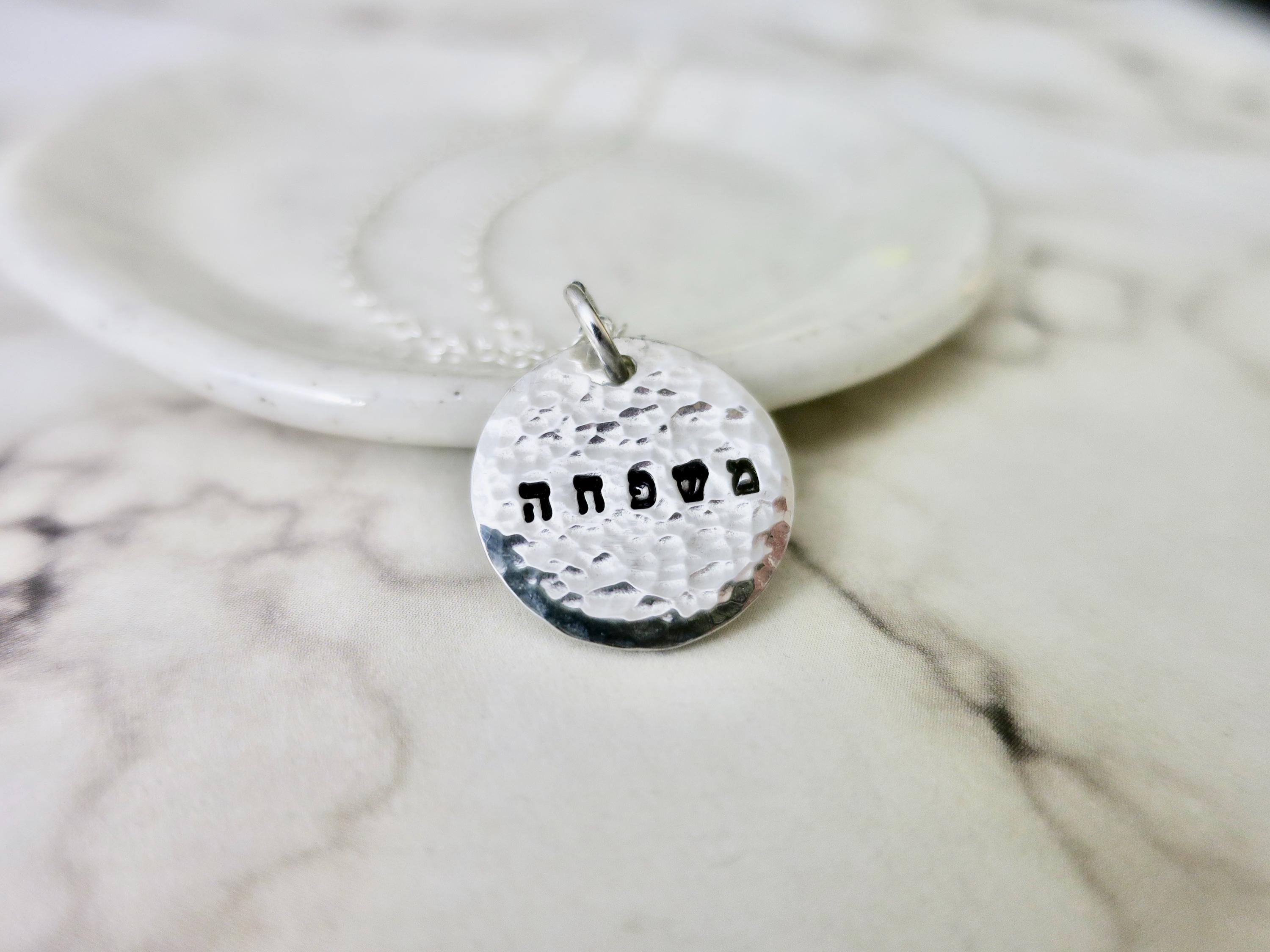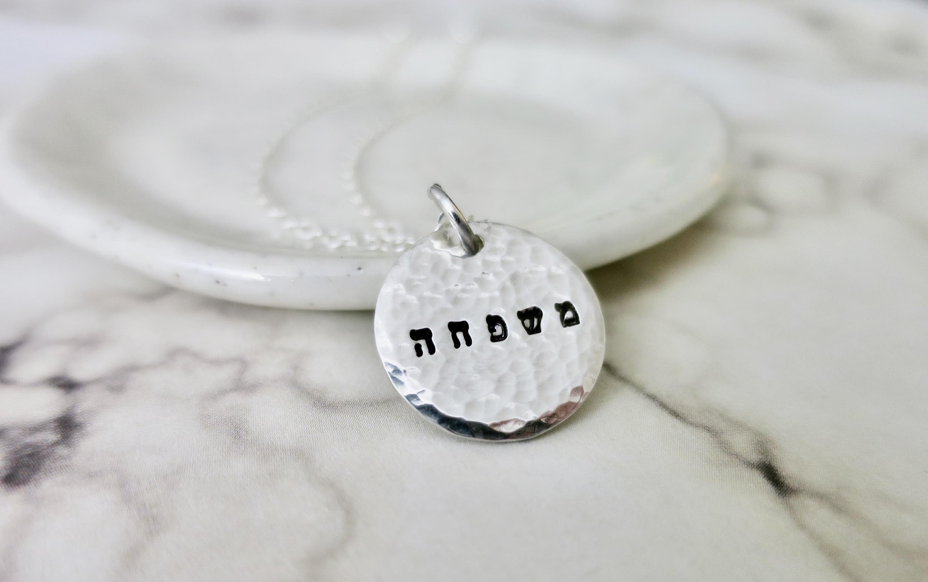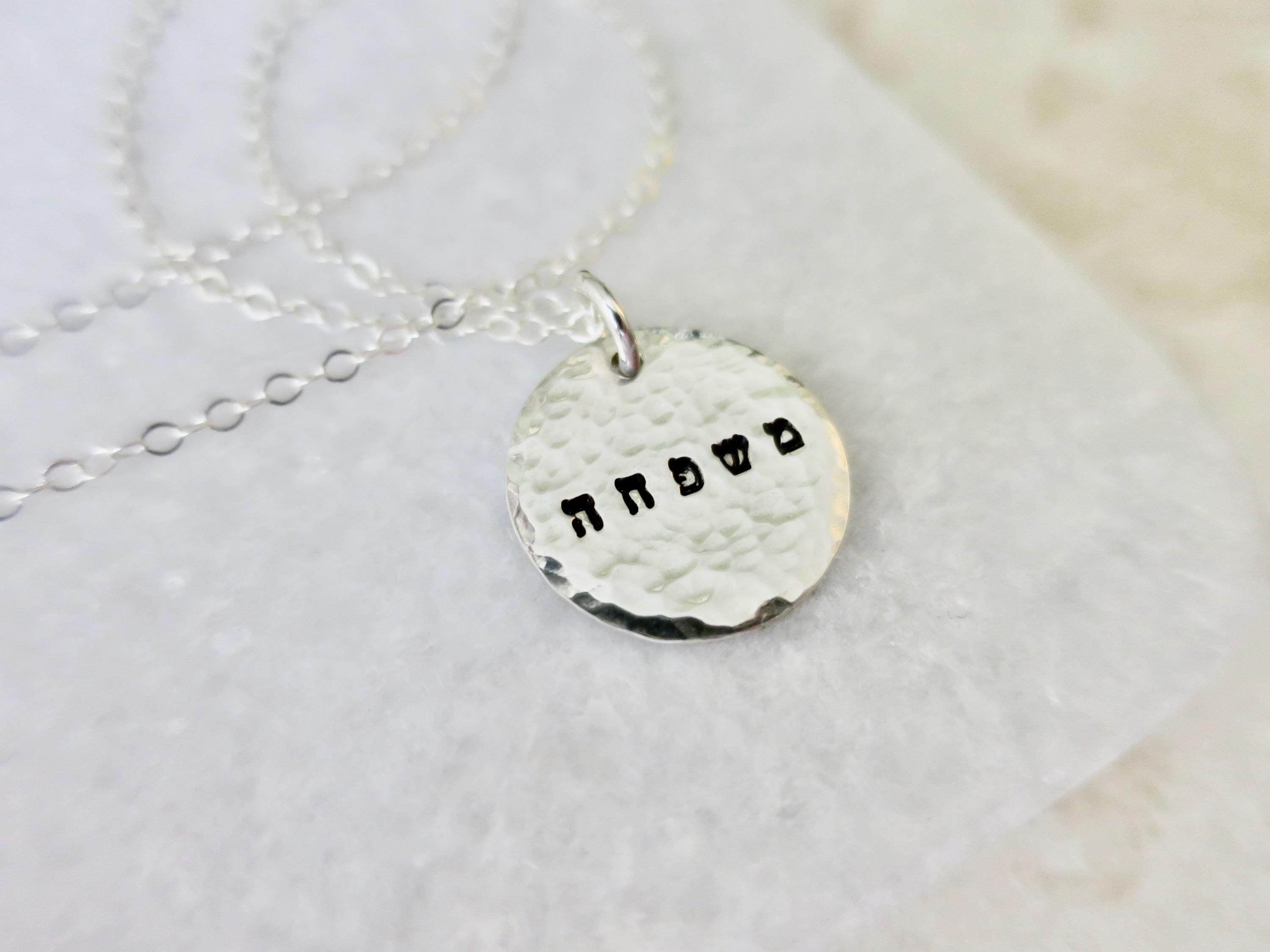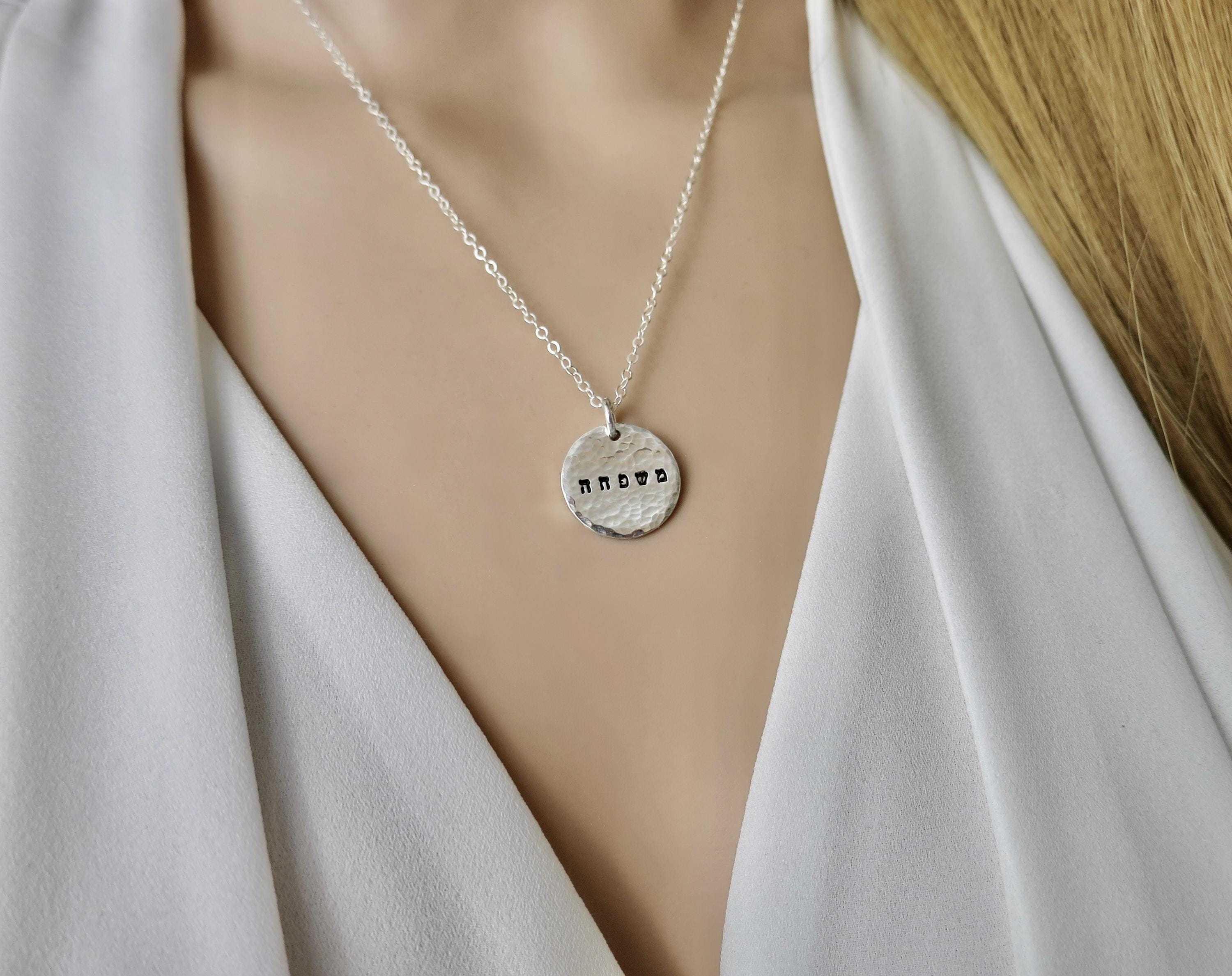 A meaningful piece that celebrates the bond of family. This handcrafted sterling silver necklace features "משפחה" (mishpacha - Hebrew for "family") delicately hand stamped in tiny 1.5mm Hebrew letters on a beautifully hammered disc pendant.