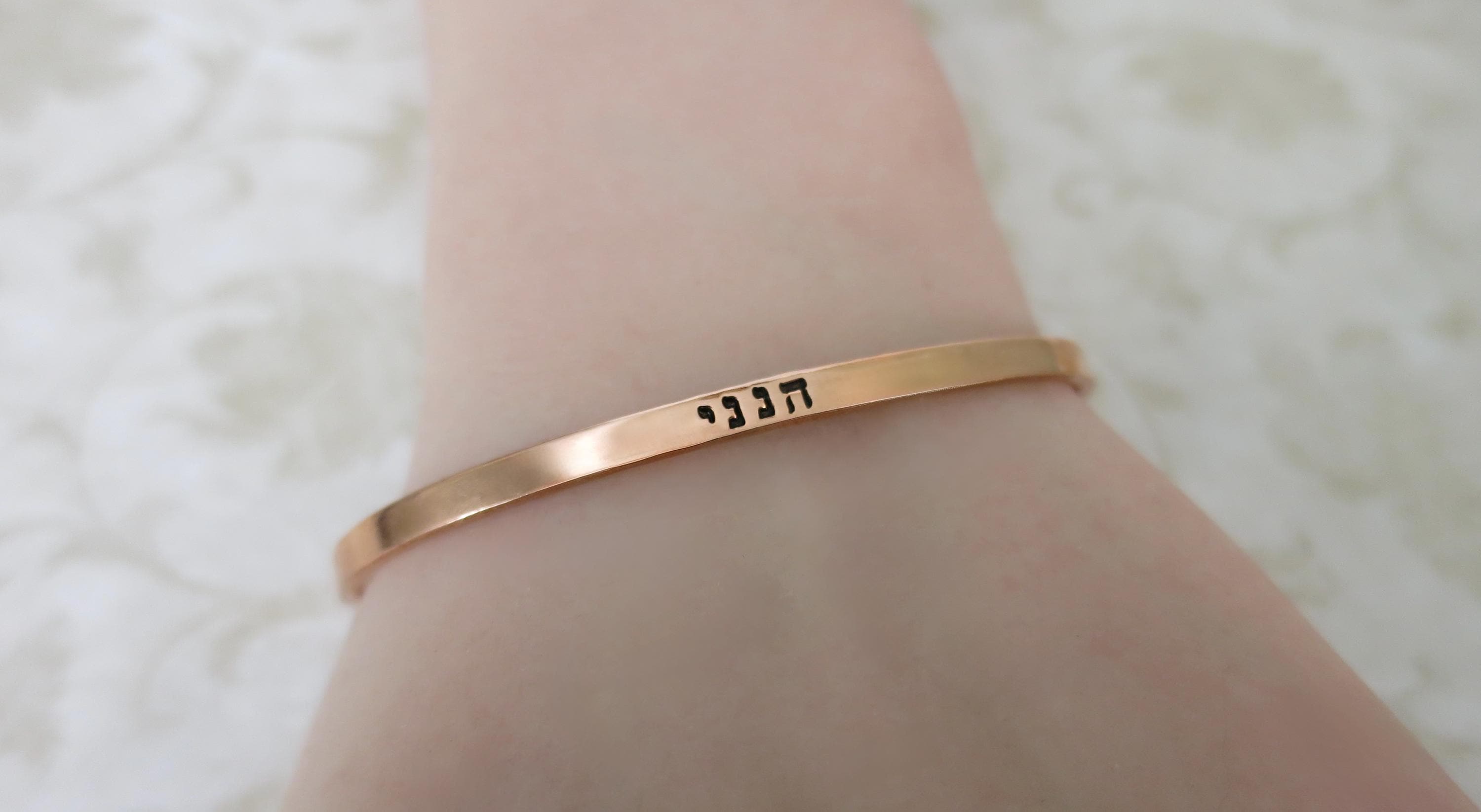 Wear a word that moves you. This delicate 1/8" copper cuff is hand stamped with custom Hebrew lettering — a beautiful way to carry a name, a prayer, or a promise close to your wrist.