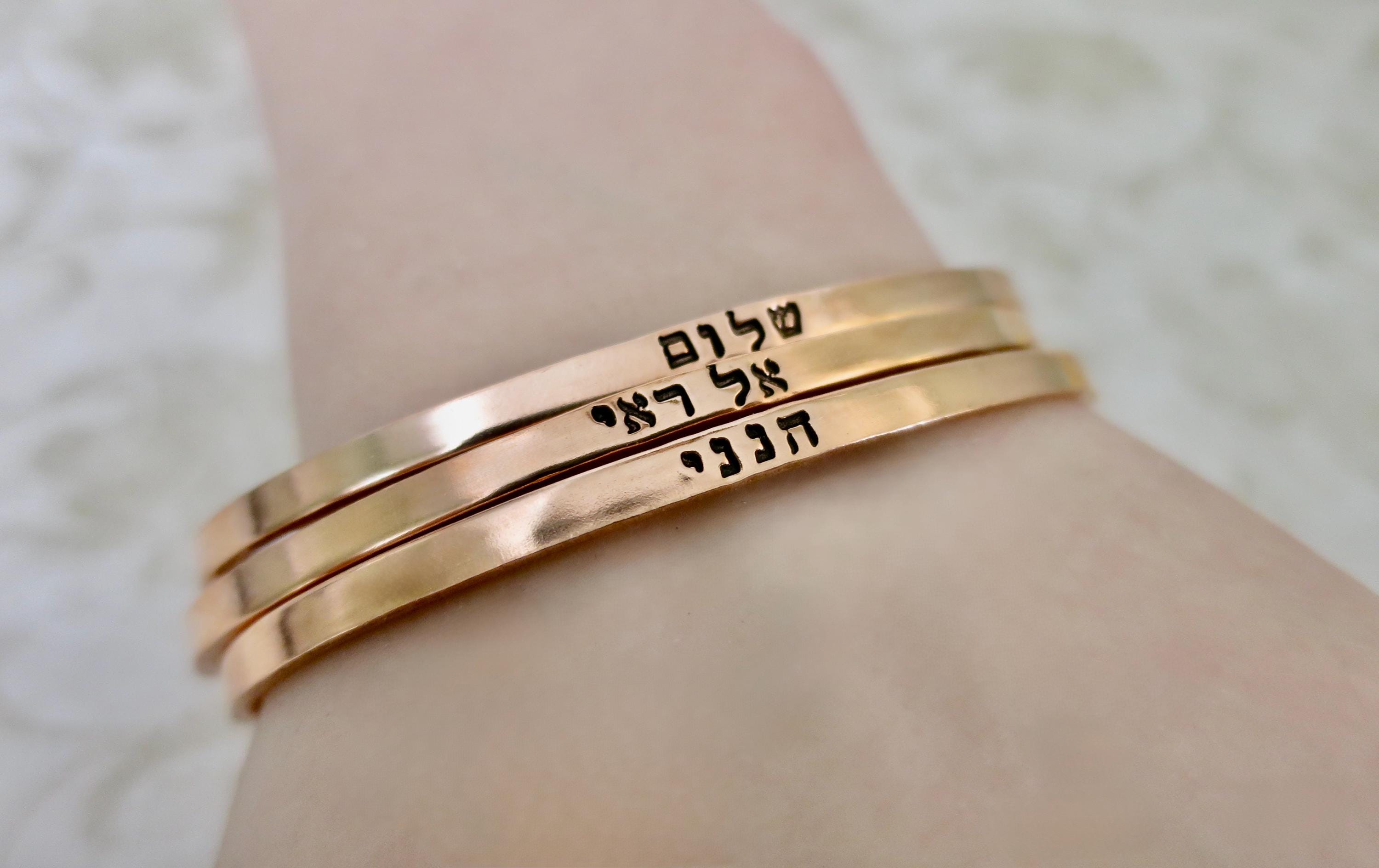These skinny cuffs are designed to stack beautifully. Mix a word cuff with a plain hammered band, or layer two Hebrew words for a collection that tells your story.