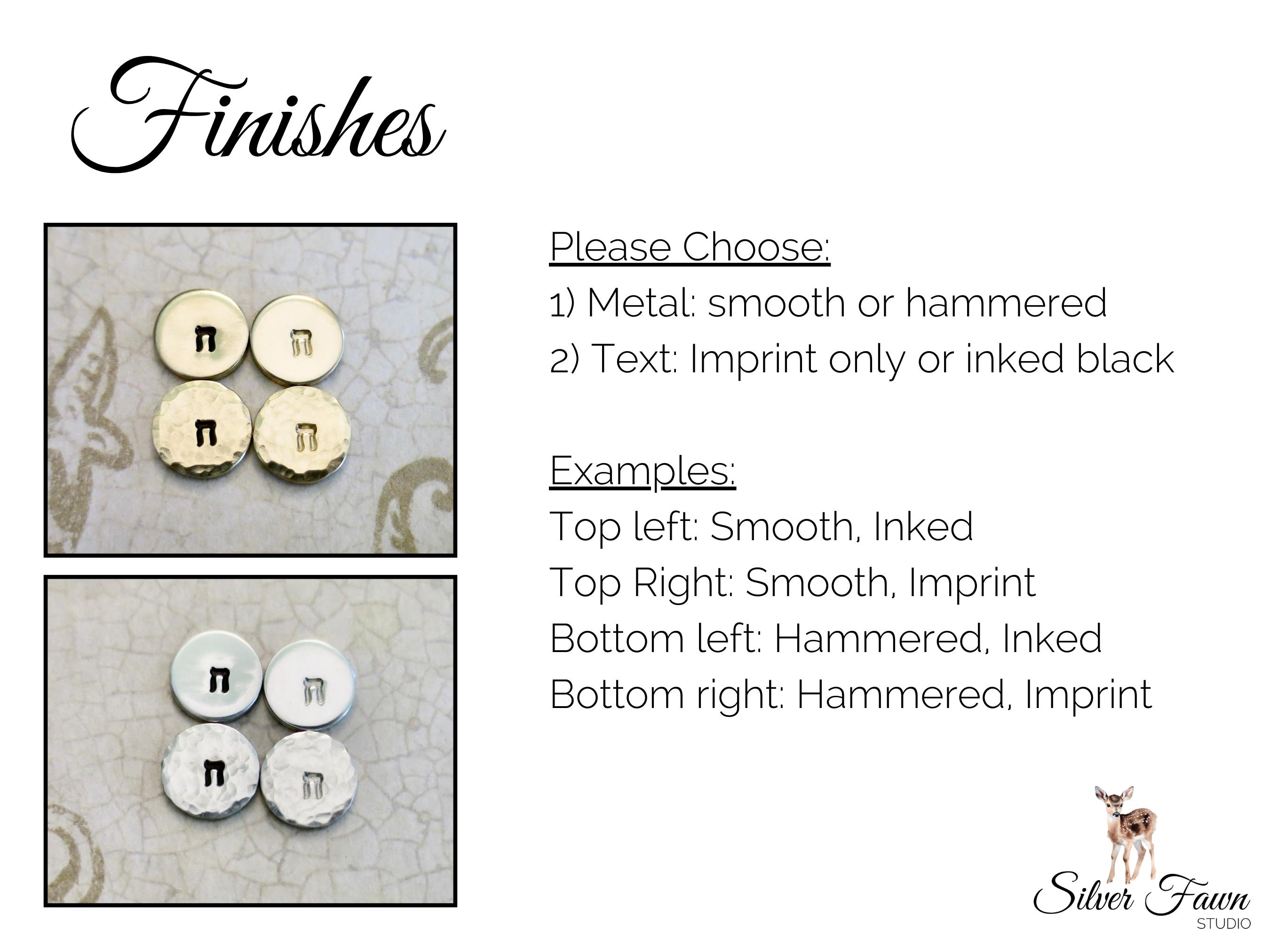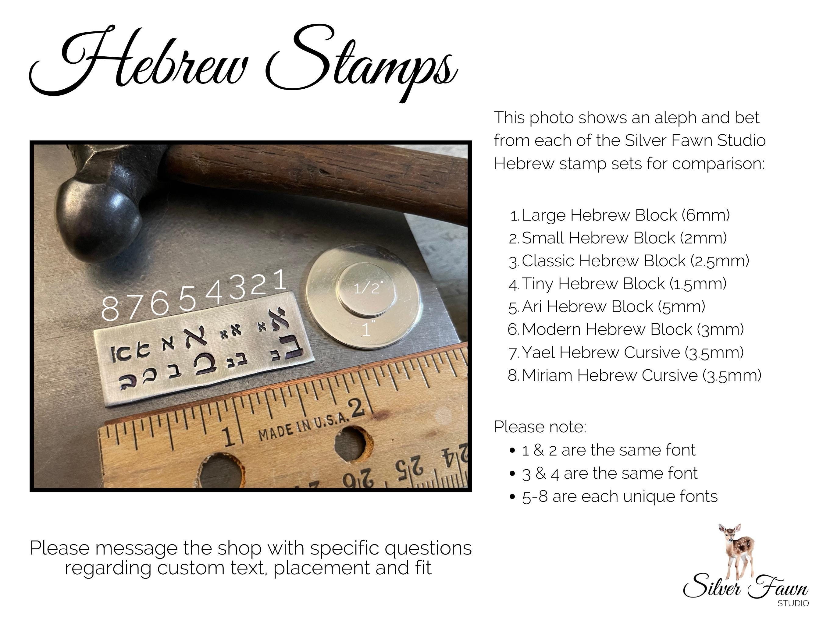 - Hand stamped in Modern Block Hebrew font