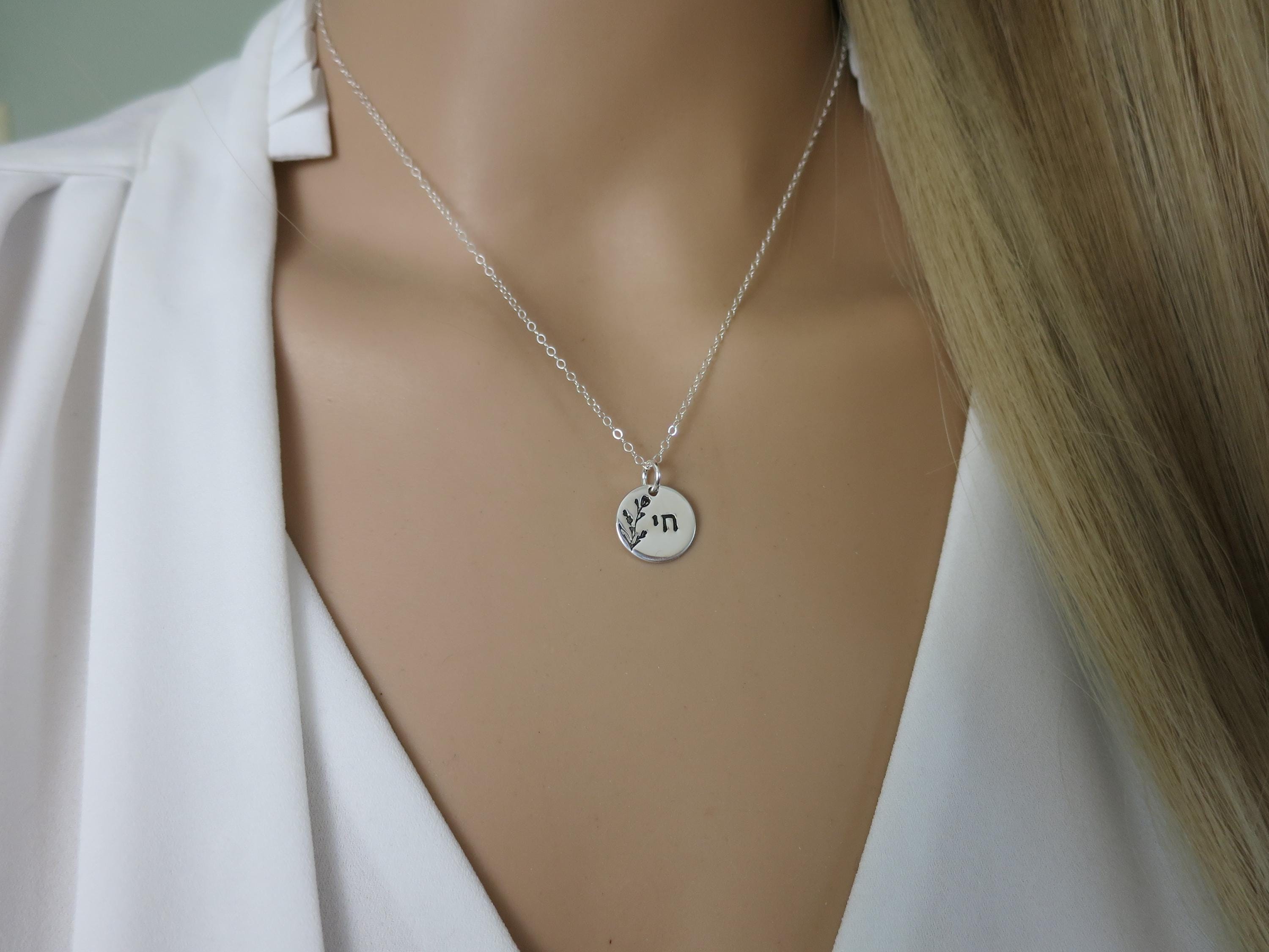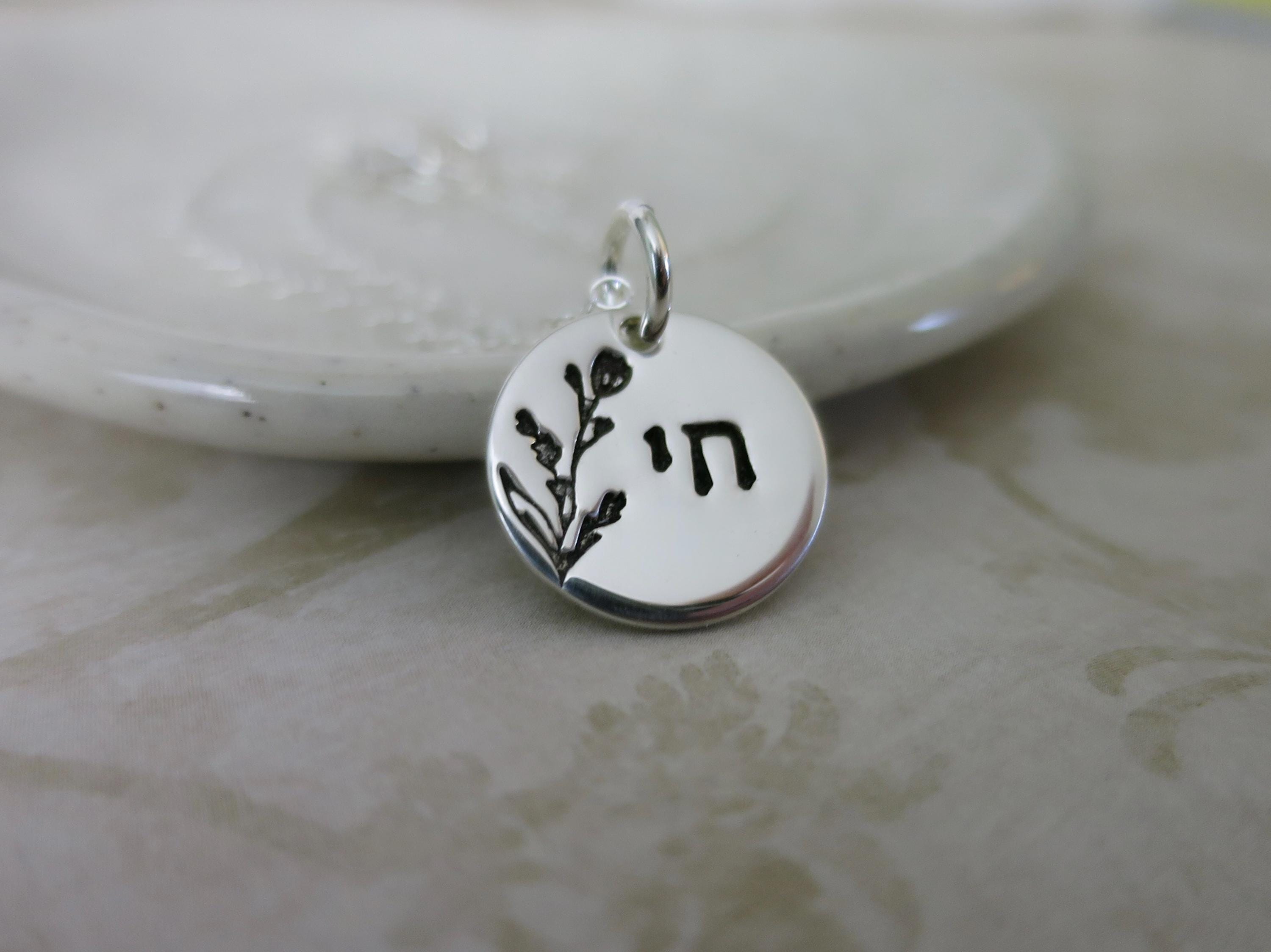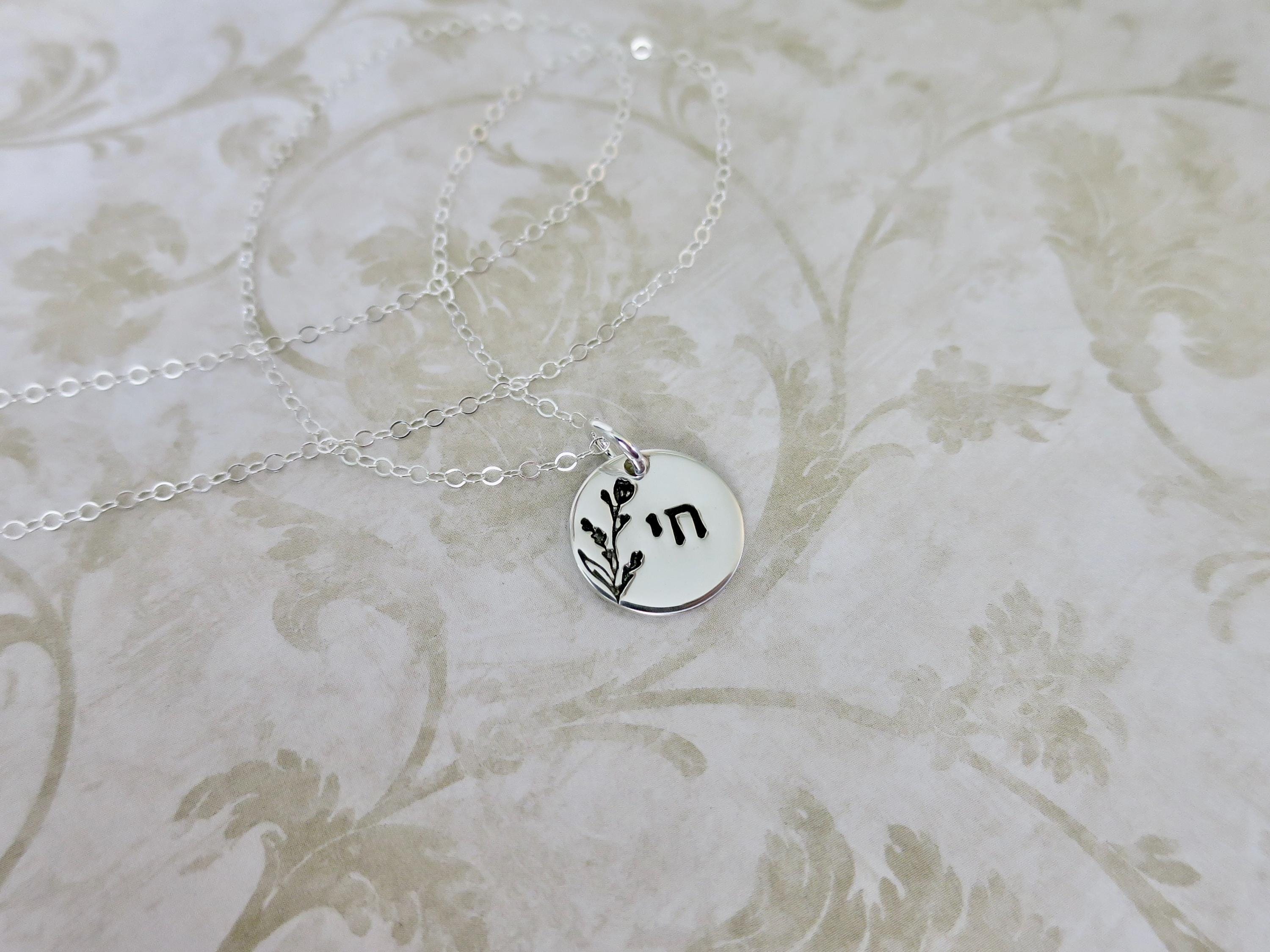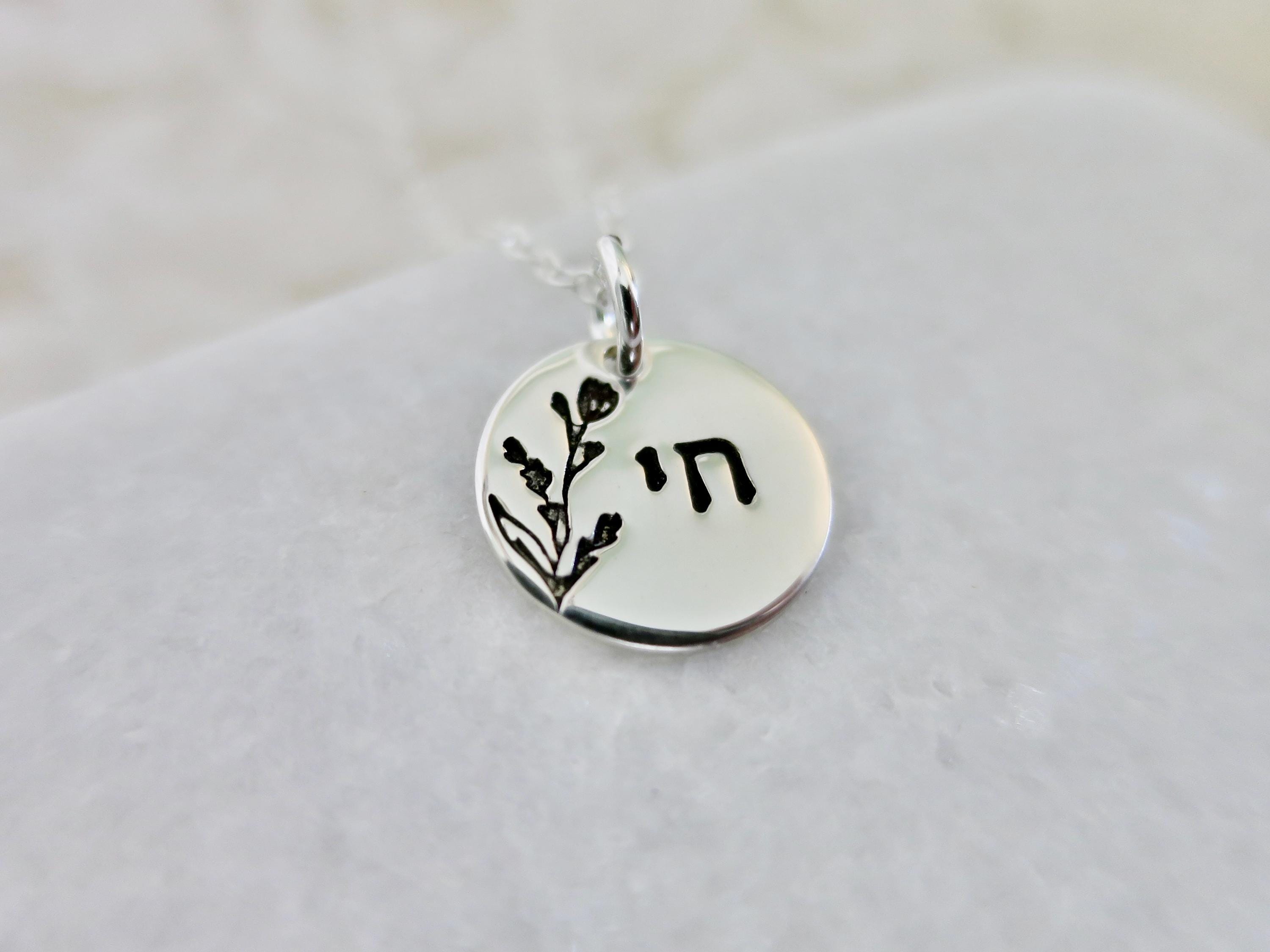 This sterling silver pendant is hand stamped in crisp Modern Block Hebrew lettering, featuring the symbol of Chai (חי), meaning life, centered to the right, balanced by a graceful jasmine bud floral stem that rises along the left side, filling the vertical space with organic softness. Together, they create a composition that feels both intentional and effortless.