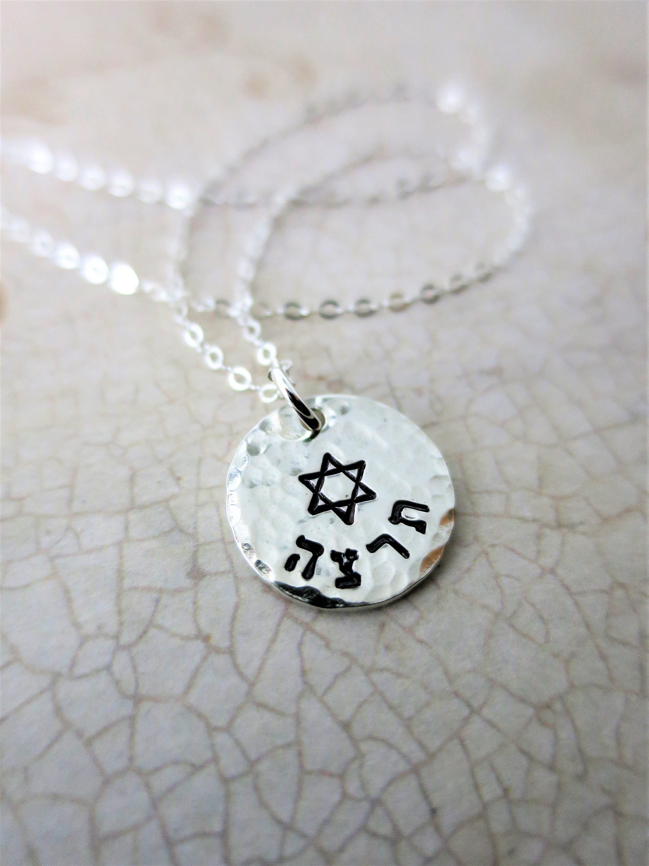 ∞ This lovely necklace makes a perfect gift for your Jewish girl! Hand stamped with her name in Hebrew, as well as a Star of David, this necklace looks lovely worn alone or paired with other layering necklaces. It has a modern but organic look, with a hammered, shiny and ink-darkened finish for depth and contrast.